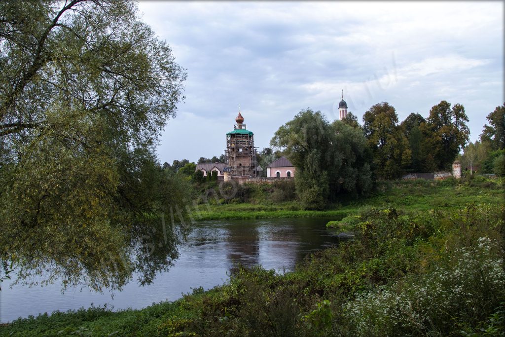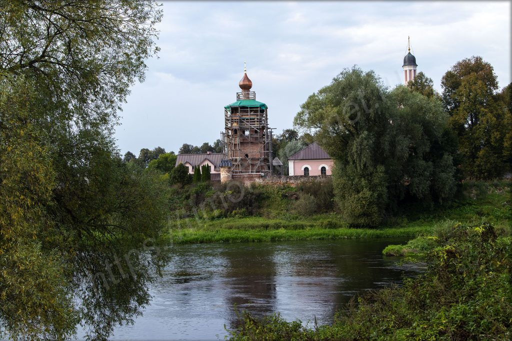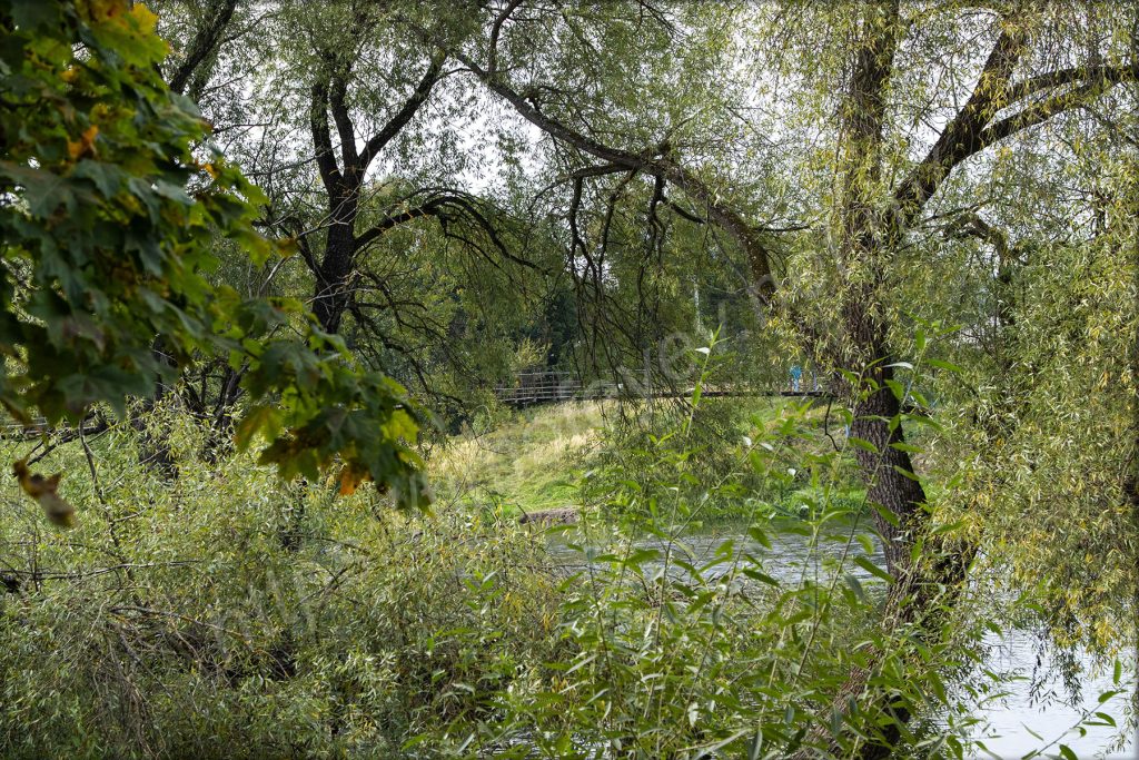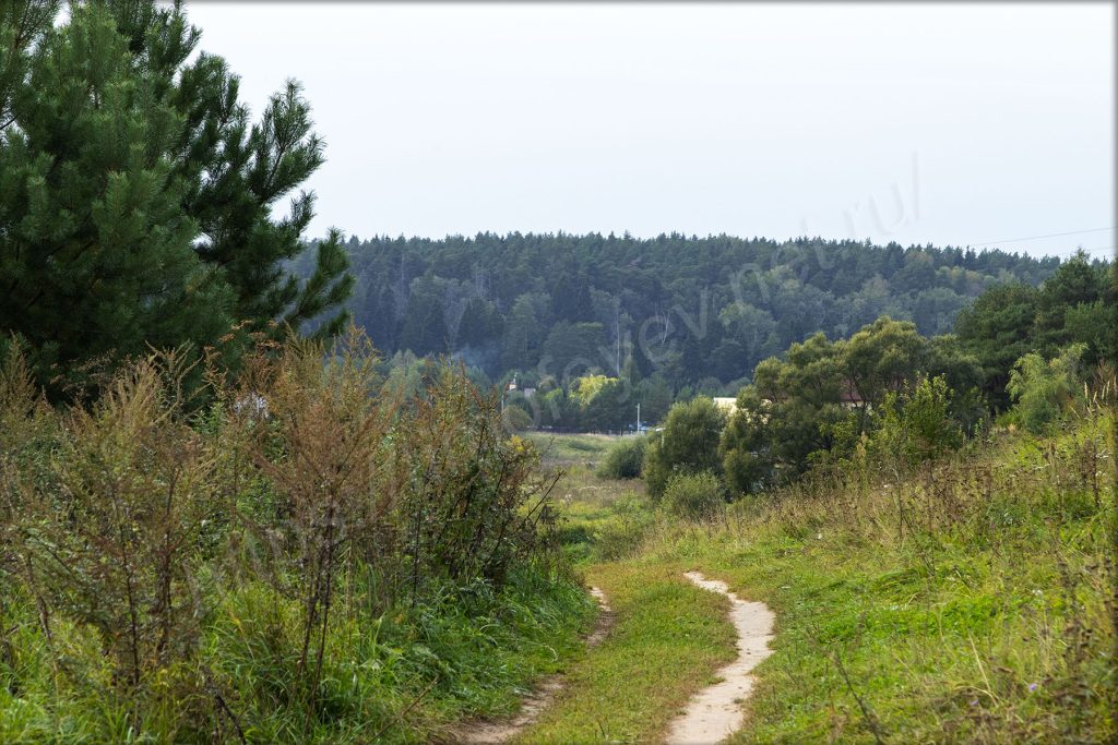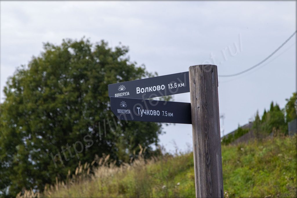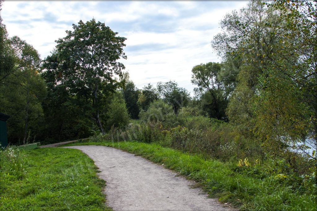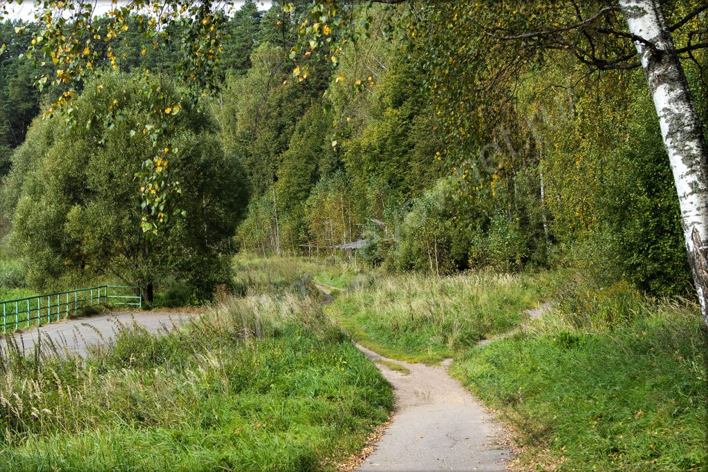 Остановился на развилке, от которой в одну сторону — к подвесному мосту, а в другую — в сторону Волково. Мне сегодня в сторону Волково, но вначале надо будет сделать несколько фотографий: моста через Москву-реку, и Воскресенской церкви, сейчас затянутой лесами на время реставрации, на другом берегу.
