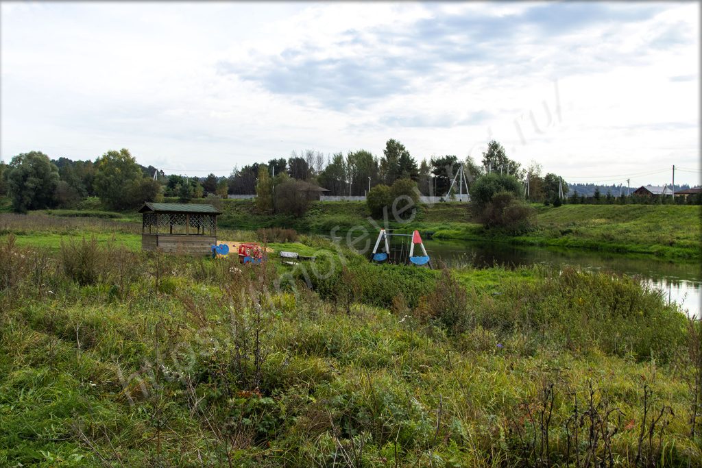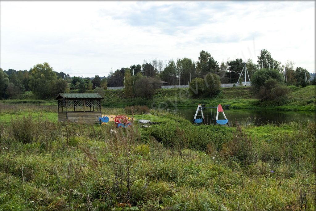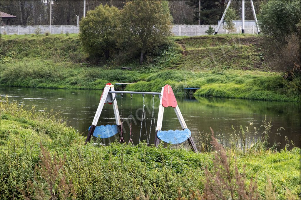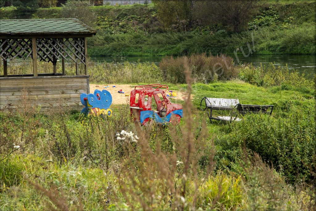 За поворотом находится детская площадка, которую давным-давно видел с того берега. Судя по качелям, она либо из конца девяностых или начала нулевых. Сейчас такие не делают. Рядом стоит беседка, видимо, для родителей, и есть песочница без бортов.