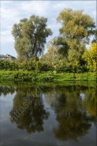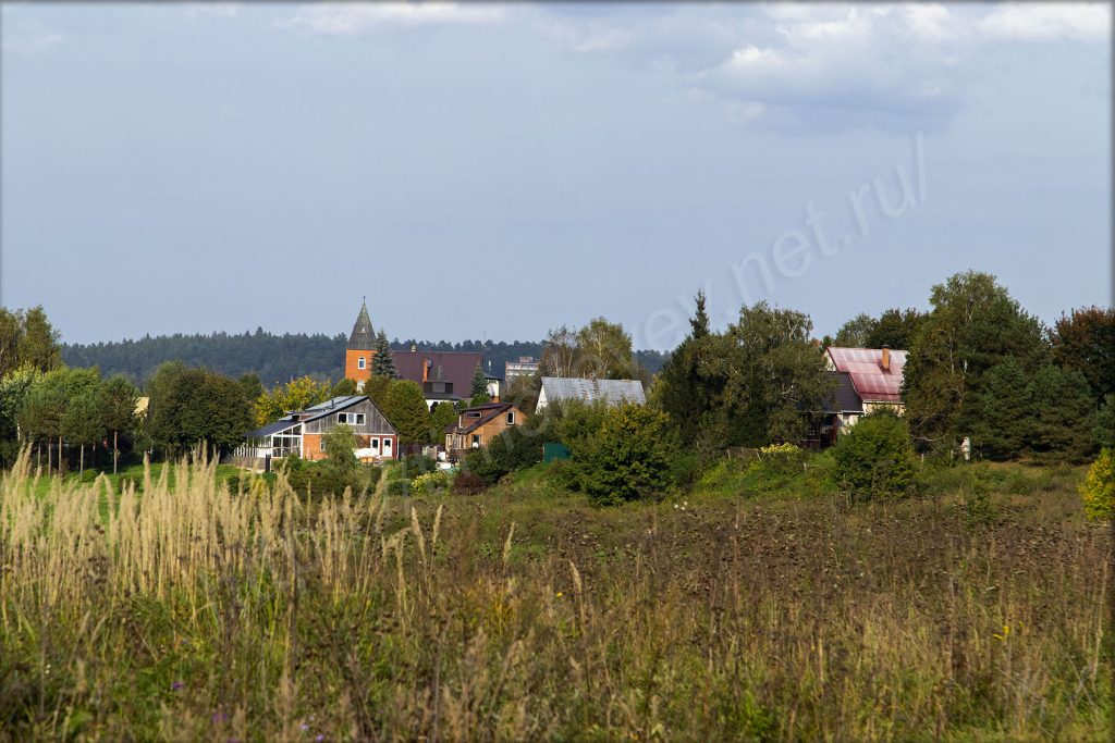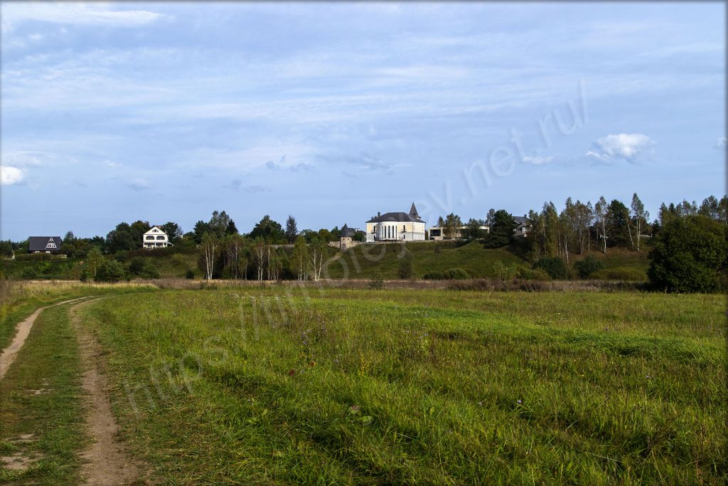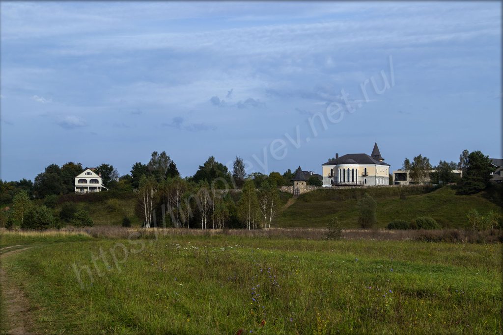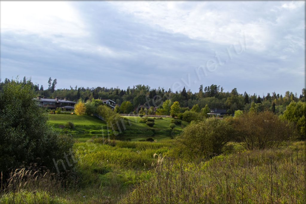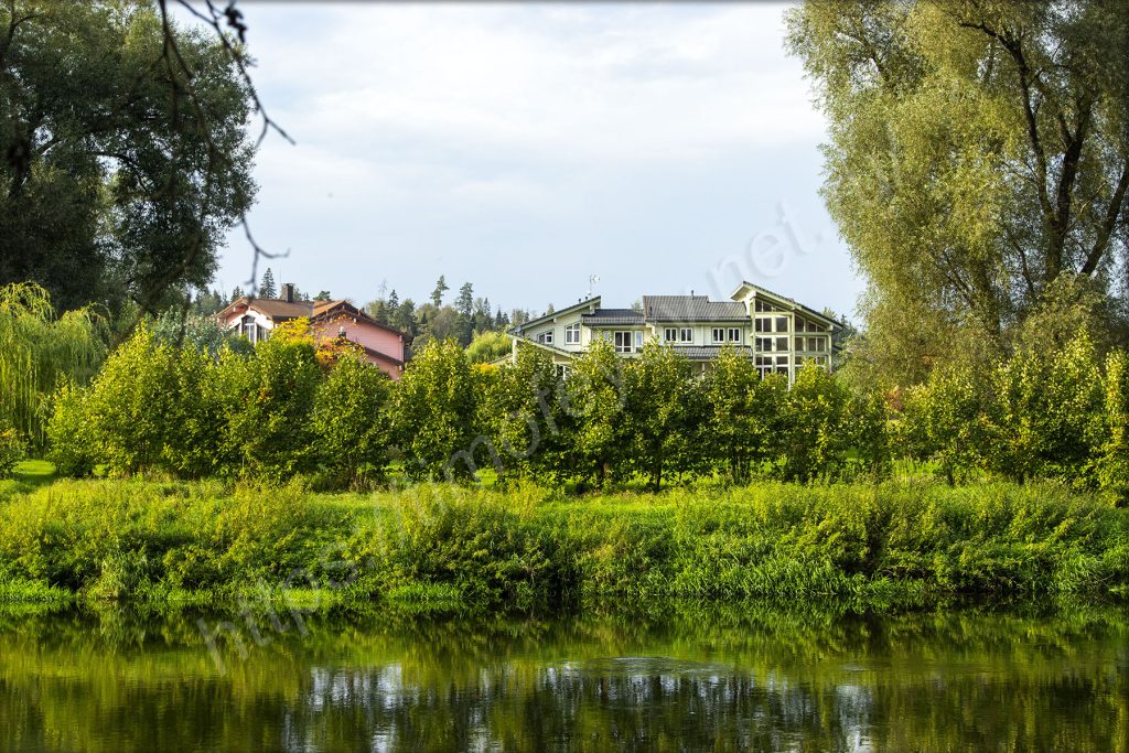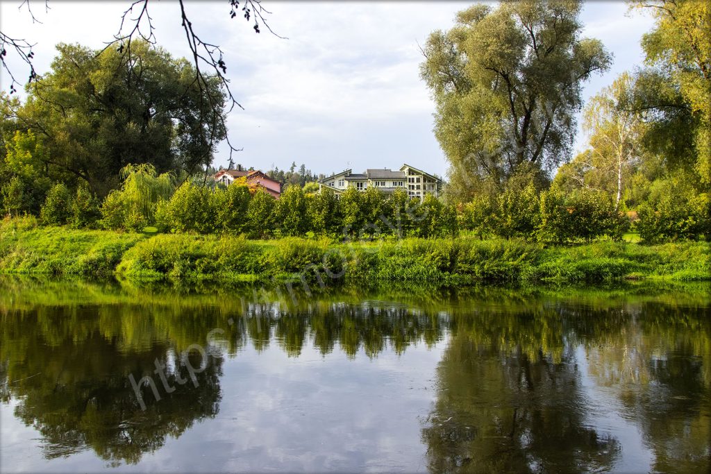 И здесь на противоположной стороне коттеджный посёлок, только вода закрыта зелёной изгородью.