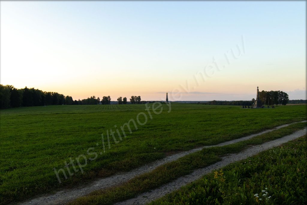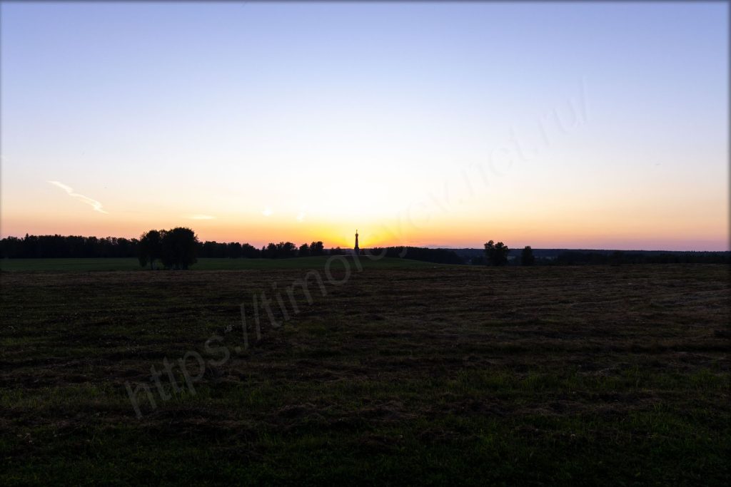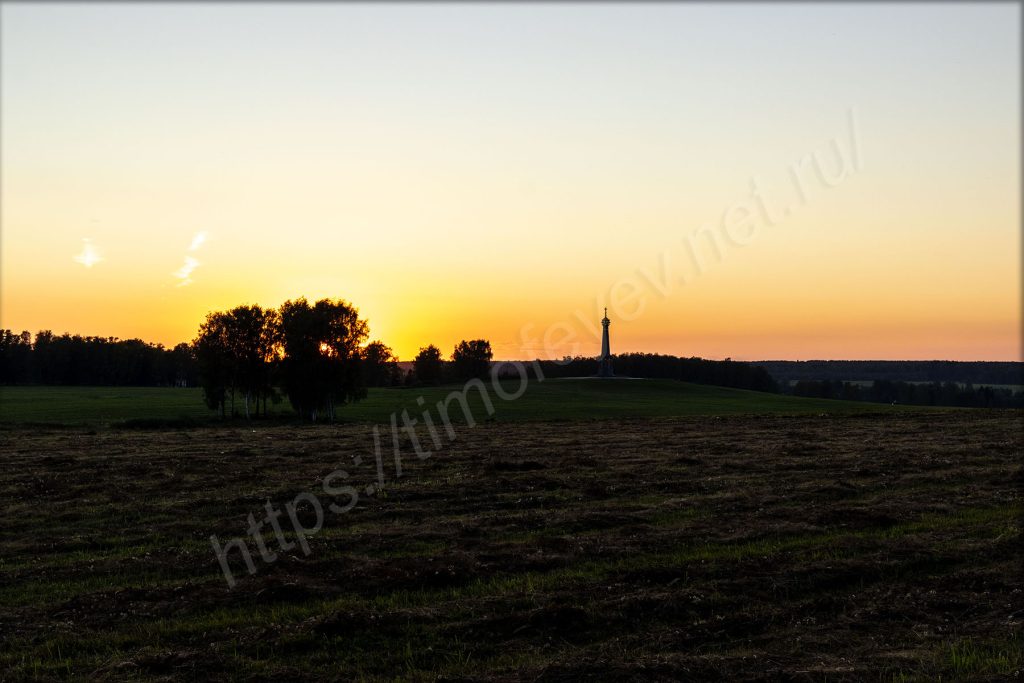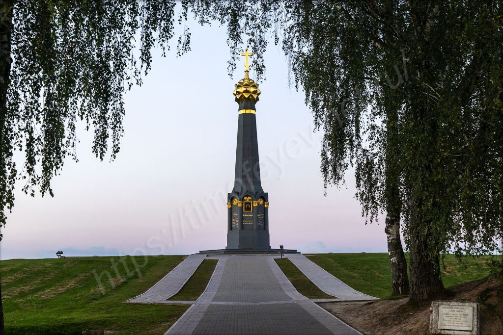 Главный монумент. Дожидаться включения подсветки не стал. Пока ехал от него, то видел, как проходил последний автобус по направлению вокзала в Бородино.