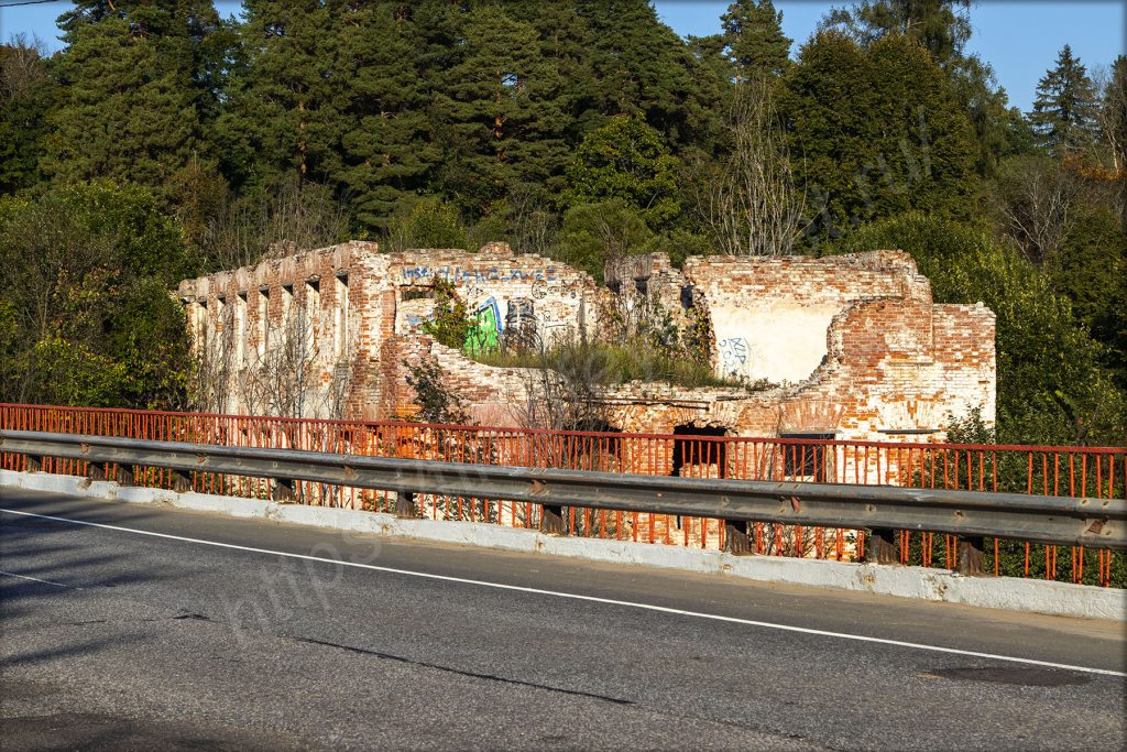 Слева полуразрушенное здание (почти остов) Суконной фабрики, а через дорогу — остатки суконно-бумагопрядильной фабрики графа Уварова.