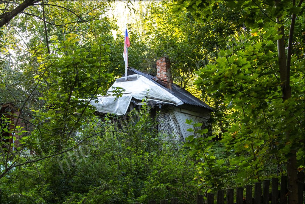 Дом возле Соловьиной рощи, утопающий в зелени. Это смотрится очень красиво. Перед домом стоят теплицы и есть прочие огороды жителей, а для того, чтобы туристы туда не заходили, всё огорожено сеткой.