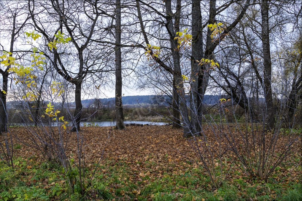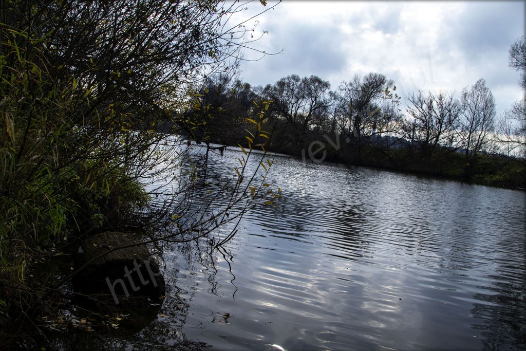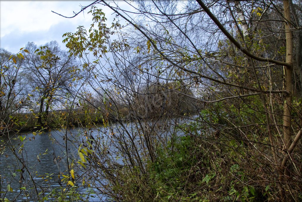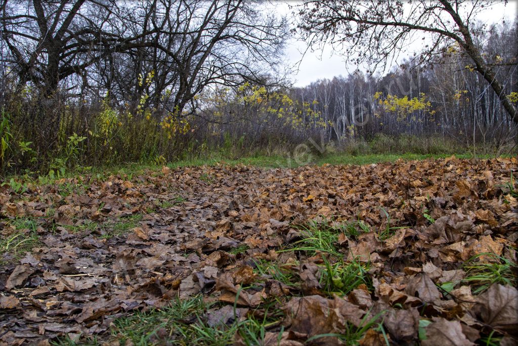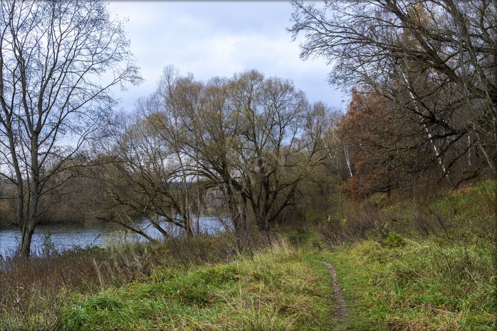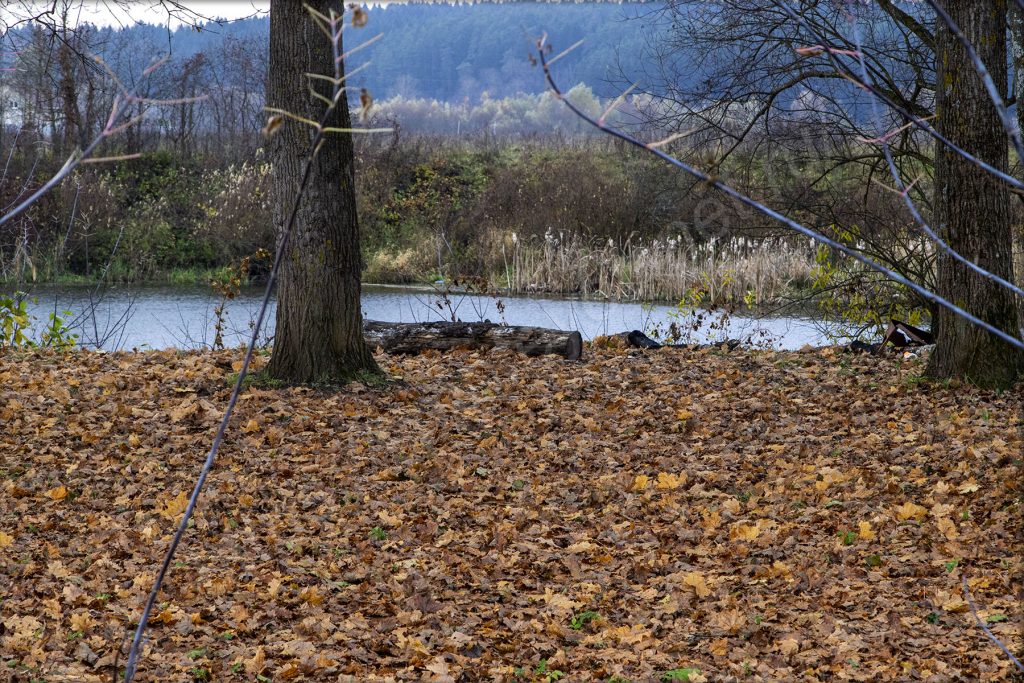 Вчерашний наряд деревьев из листьев, сегодня укрыл землю, словно чешуйками, создав плотное и тёплое одеяло. Вода в Пахре сегодня серебристая, как и облака. Всё вдали в какой-то туманной дымке.