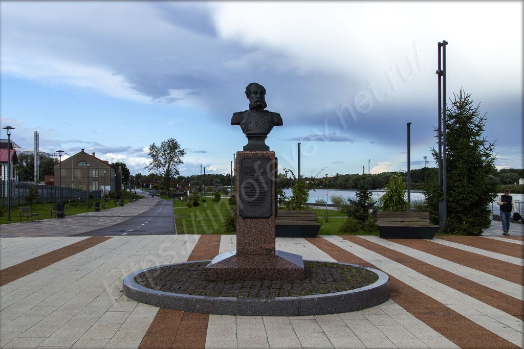 На набережной стоит бюст адмиралу Путятину, проводившему своё детство тут, в Новгородчине.