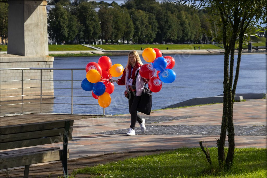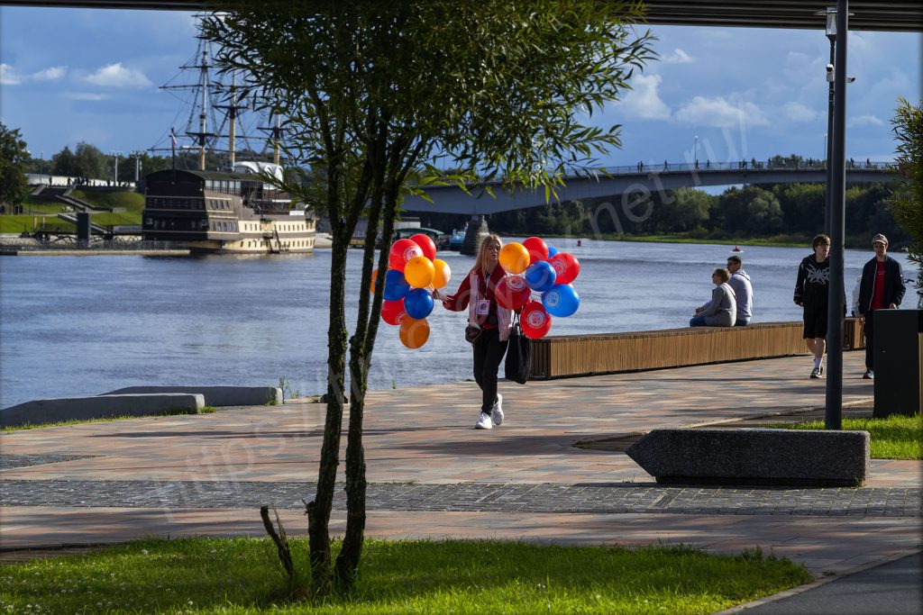 Девочка с шарами идёт, видимо, на праздник к детям, который проводится чуть дальше у кафе.