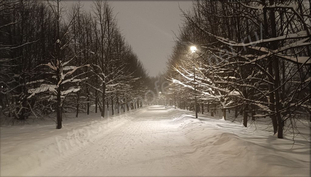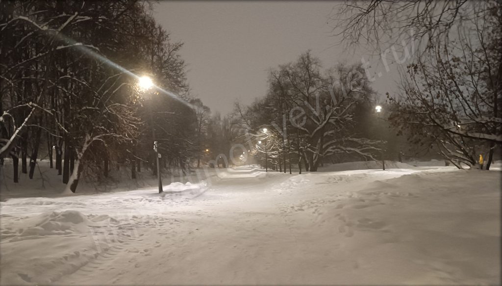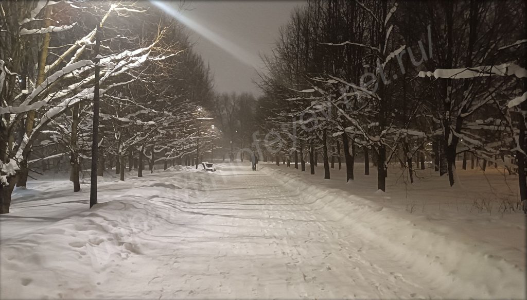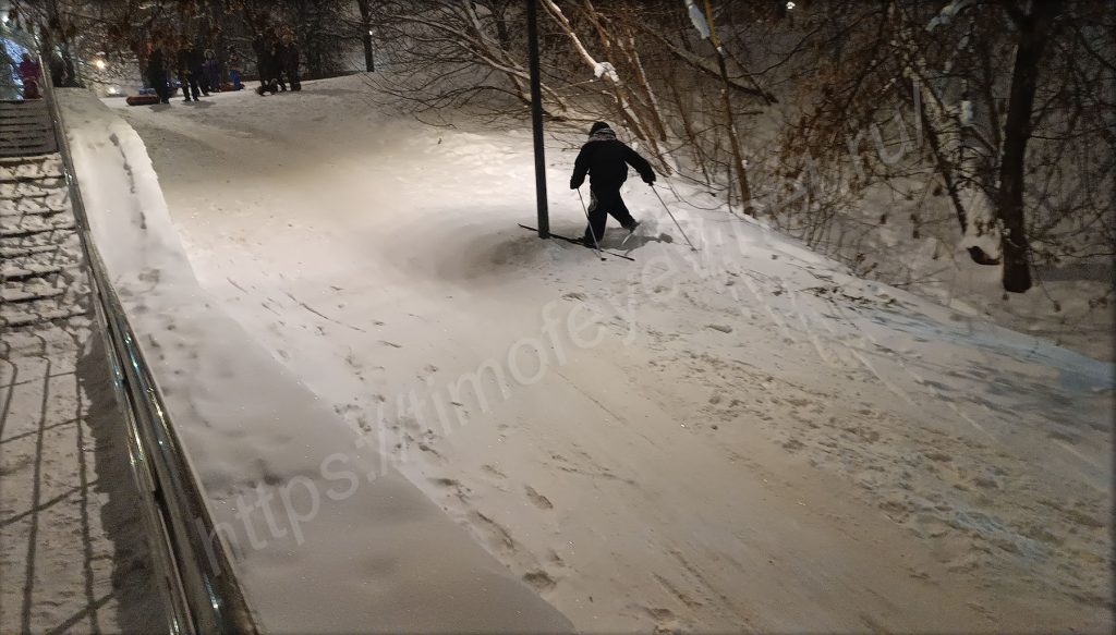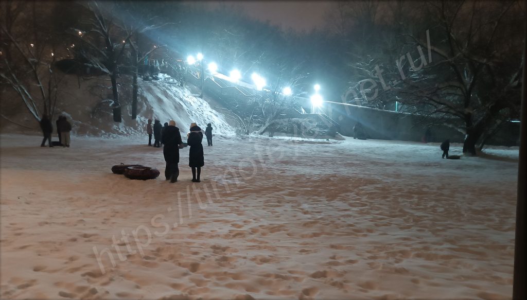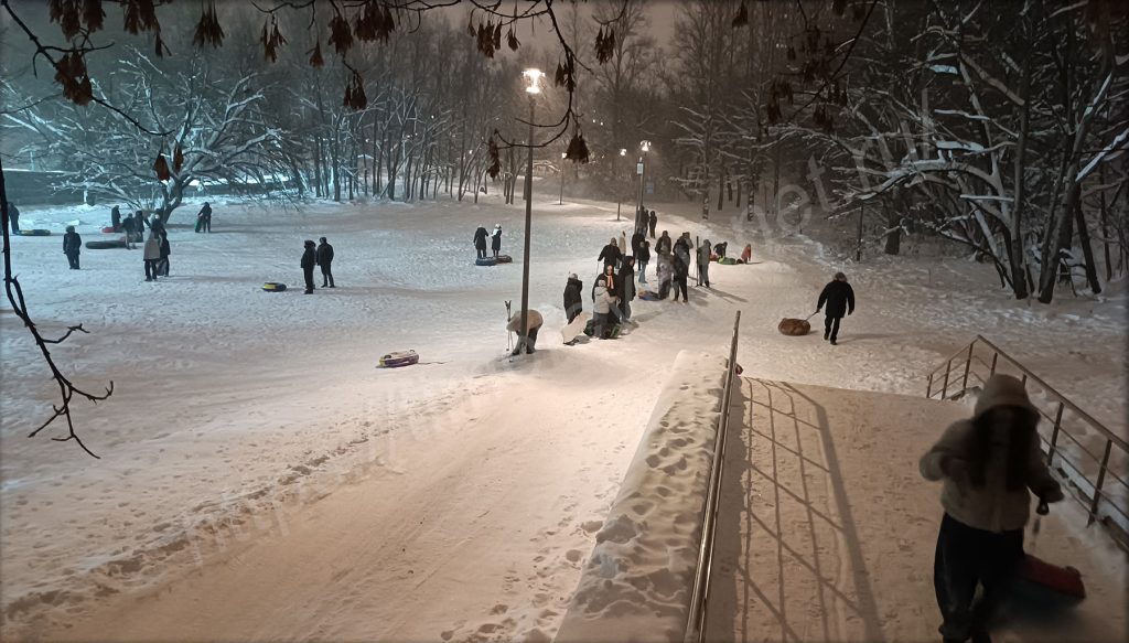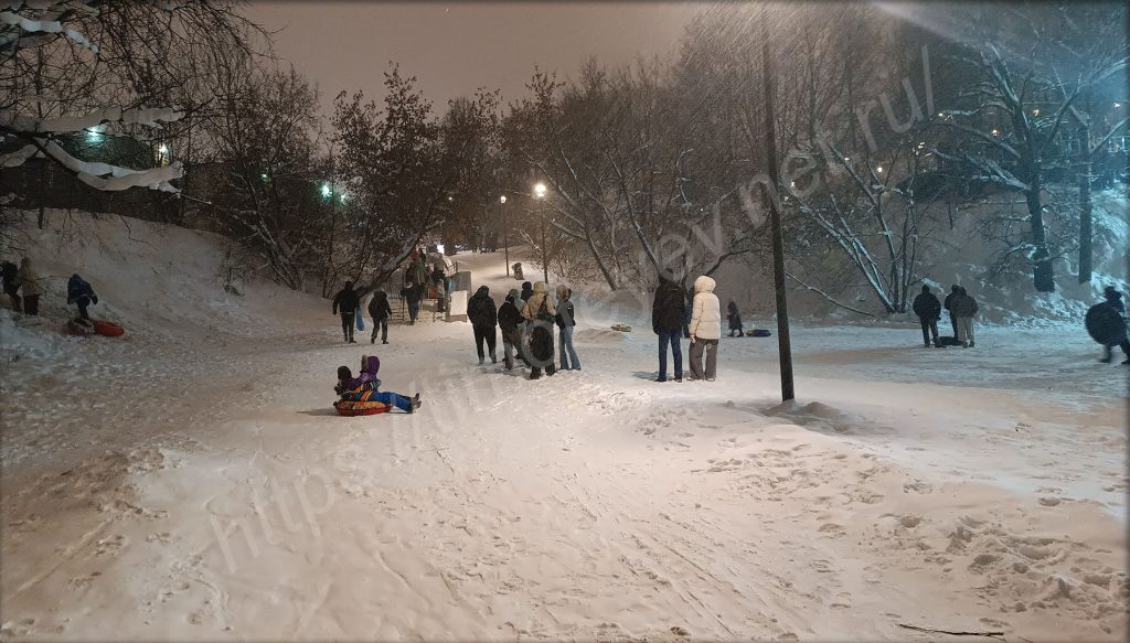 Приятно вечерком возвращаться домой через парк. Особенно, когда так приятно сыплет с неба снежочек. Непогоде наоборот все рады. Нет слякоти, нет пока ещё сильных морозов, но кружит снежок. У метро, недалеко от входа в парк, построен длинный жёлоб для любителей покататься на ватрушках, но платно. Был сильно удивлён, когда увидел, что на склоне, с которого мы когда-то в детстве катались, дети катаются и сейчас: кто на ледянках, кто на ватрушках. Внизу стоят родители и контролируют спуск.