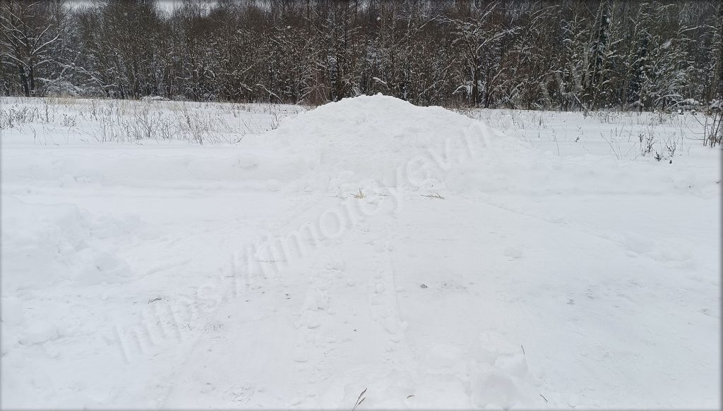 Прикидываю как минимизировать снег на участке, по максимуму вывезти его за пределы. Как и в прошлые годы, создаю горку за пределами своего участка. Для этого нужно сломать не только свой бруствер, но и на противоположной стороне, и ещё на сантиметров шестьдесят-семьдесят заглубиться, чтобы не засыпать и не сузить дорогу. Тракторист потом скажет спасибо.