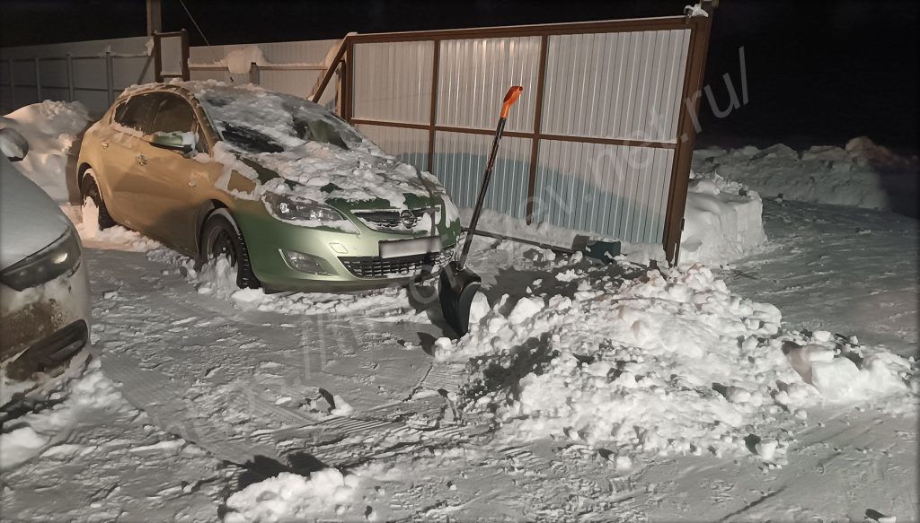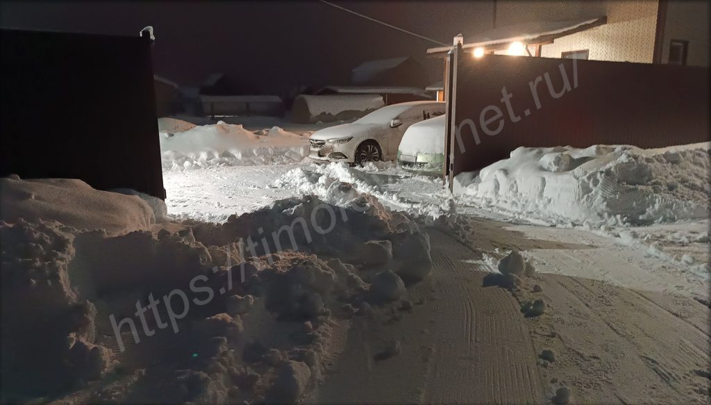 На участок попал через калитку. Иначе никак, так как помимо того, что засыпало снегом, ещё подморозило палец, который следит за положением ворот, отключая питание. В общем, дави — не дави на кнопку — результат будет одним и тем же. Как хорошо, что с собой вожу небольшую лопату для города. Сейчас она меня реально выручила.