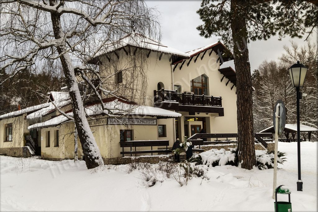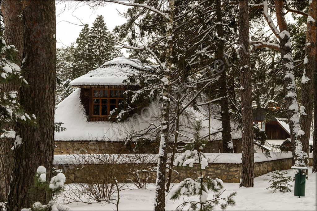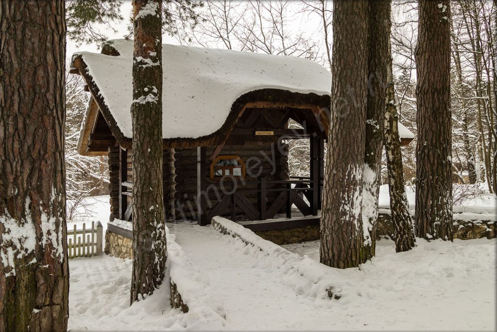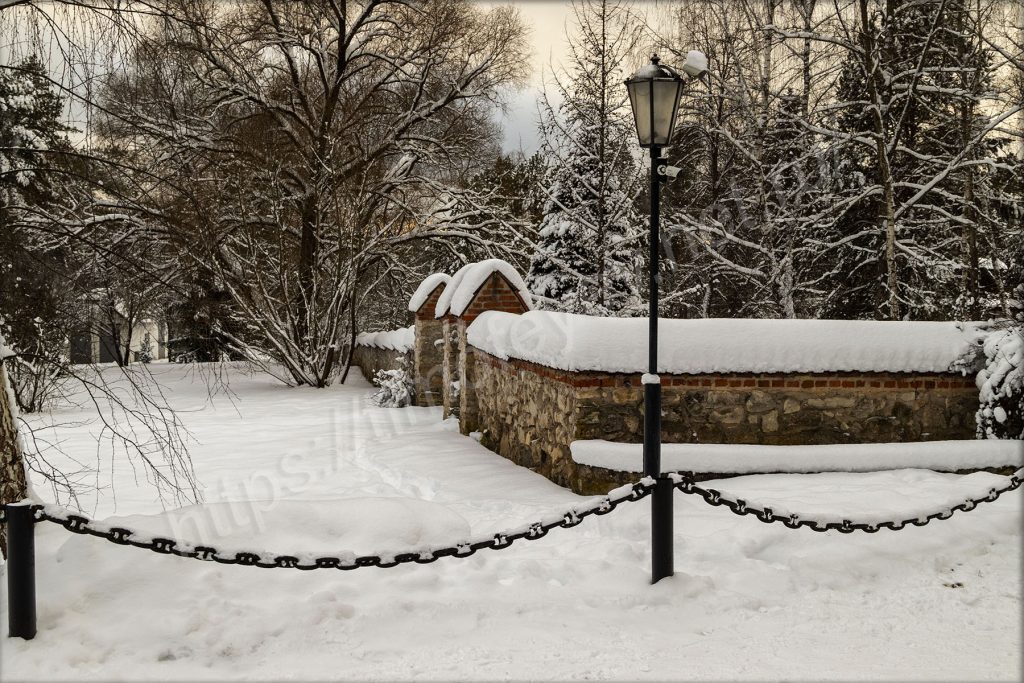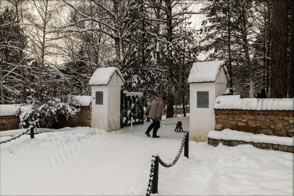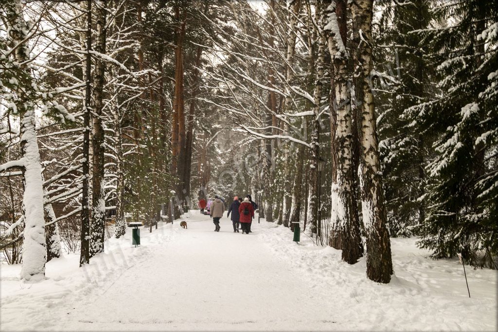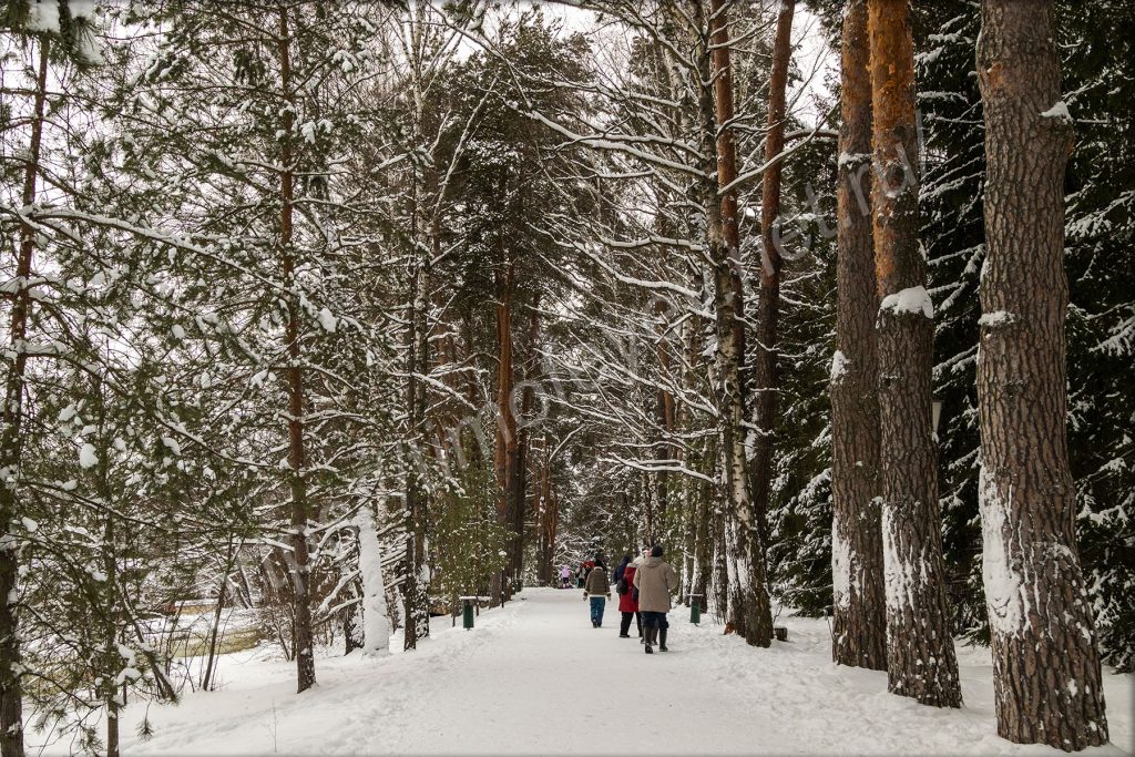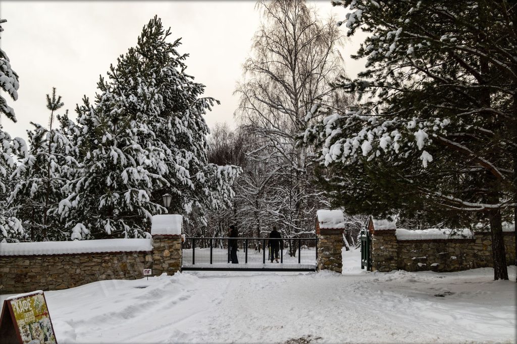 Войдя через ворота, сразу попадаю в хвойный лес. Несмотря на наличие людей, здесь очень тихо. Морозец на улице мягкий и приятный, но стоять на одном месте всё-таки прохладно.