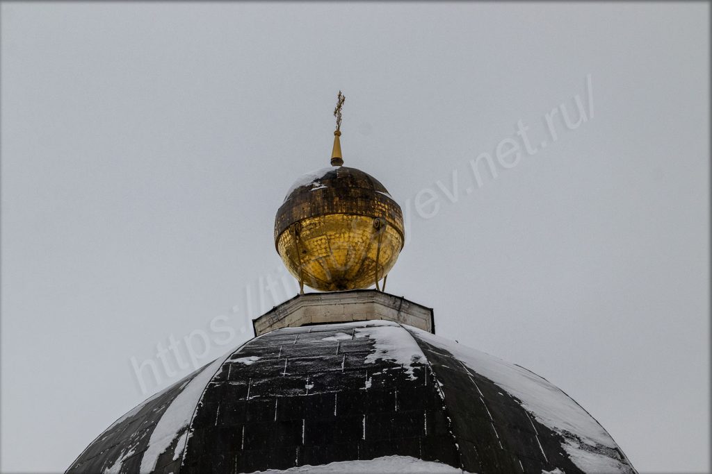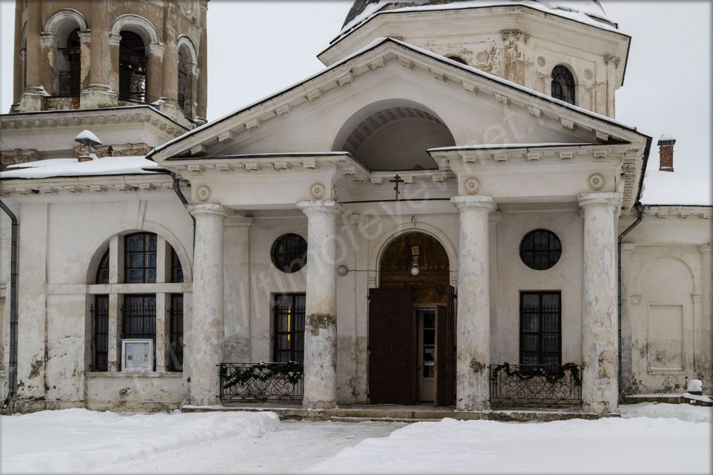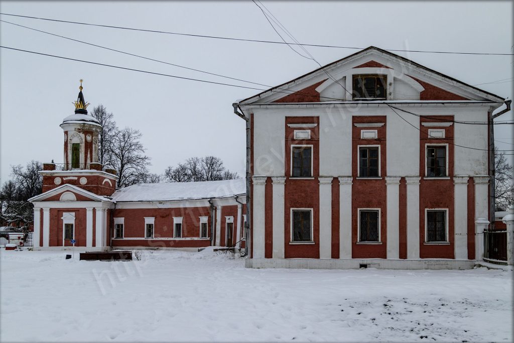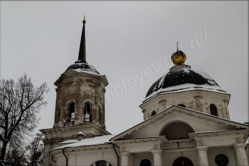 За воротами, находящихся между двумя шахматных ладьей, виден храм Иоанна Предтечи, находящегося на территории усадьбы. Он был построен в те же годы, в привычном нам стиле архитектуры «восьмерик на четверике». Рядом колокольня в том же стиле. Утренние службы по случаю светлого праздника Рождества уже завершились и людей тут нет.