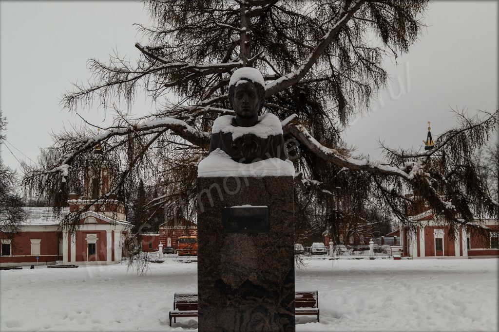 Пушкин, с покрытой головой снегом, смотрит на главный вход в усадьбу, где был всего два раза, когда приезжали вместе с женой погостить. Разница в их возрастах была тринадцать лет.