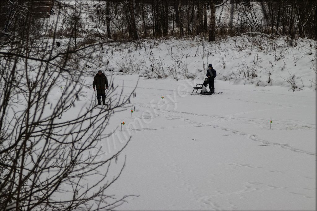 Несмотря на наступившую некоторую оттепель, рыбаков на реке предостаточно. А мимо них, пробивая и раскатывая лыжню, пробегают лыжники.