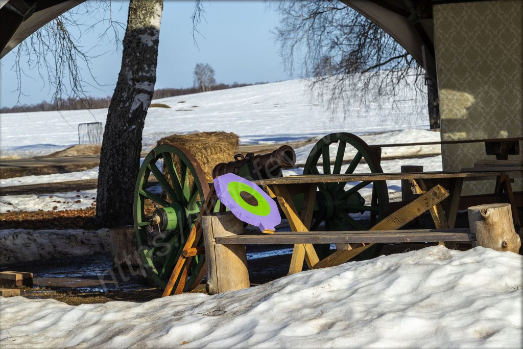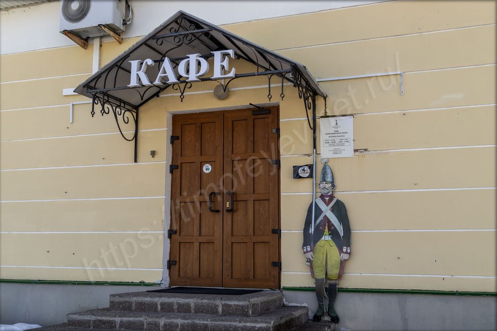 Возле кафе стоит шатёр со столиками и пушкой. Удивительно! Зачем она здесь? На мой вопрос и ответить-то некому. Ещё всюду стоят снопы с сеном. Лошадей здесь, кроме как на день Бородина, никогда не видел.