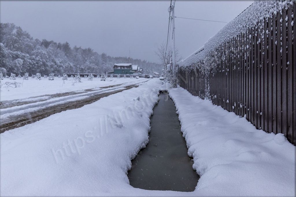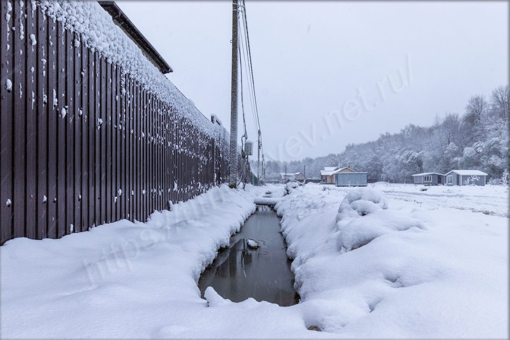 Выхожу за ворота, которые нехотя открылись и точно также не хотели закрываться за мной. А здесь — здесь настоящий «серебряный Сендей». Несмотря на то, что температура около нуля, лужи и ливнёвки сейчас не сковывает льдом. Земля своё тепло отдаёт активно.