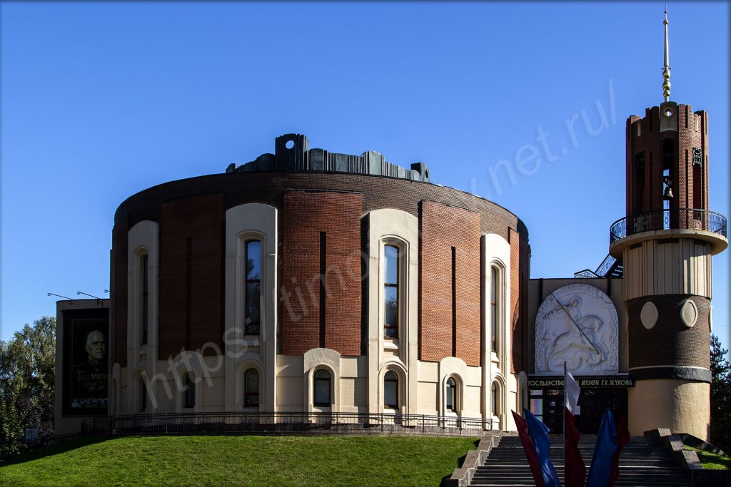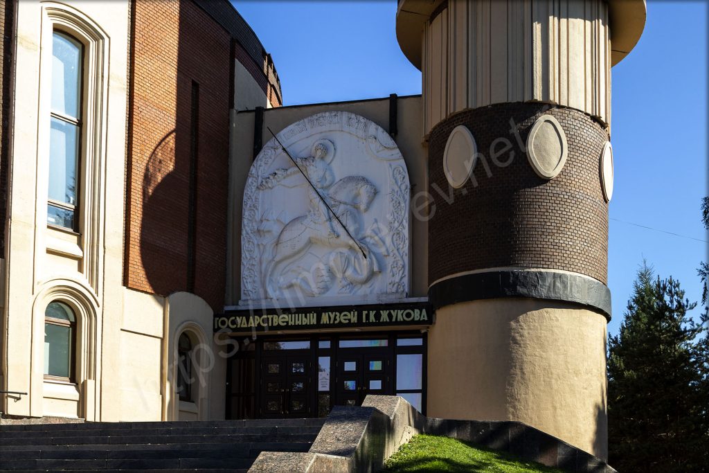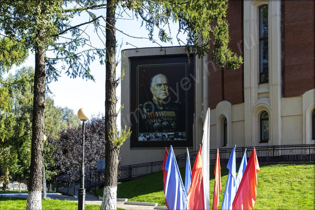 Аллея обрамлена бортами и бюстами восьми героев Советского союза, и ведёт к бюсту Жукова, важно вздымающего свою грудь, покрытую звёздами четырежды героя СССР. Он установлен прямо перед музеем. Смотря на Жукова, мне почему-то мерещится герб Российской Империи в объёме.
