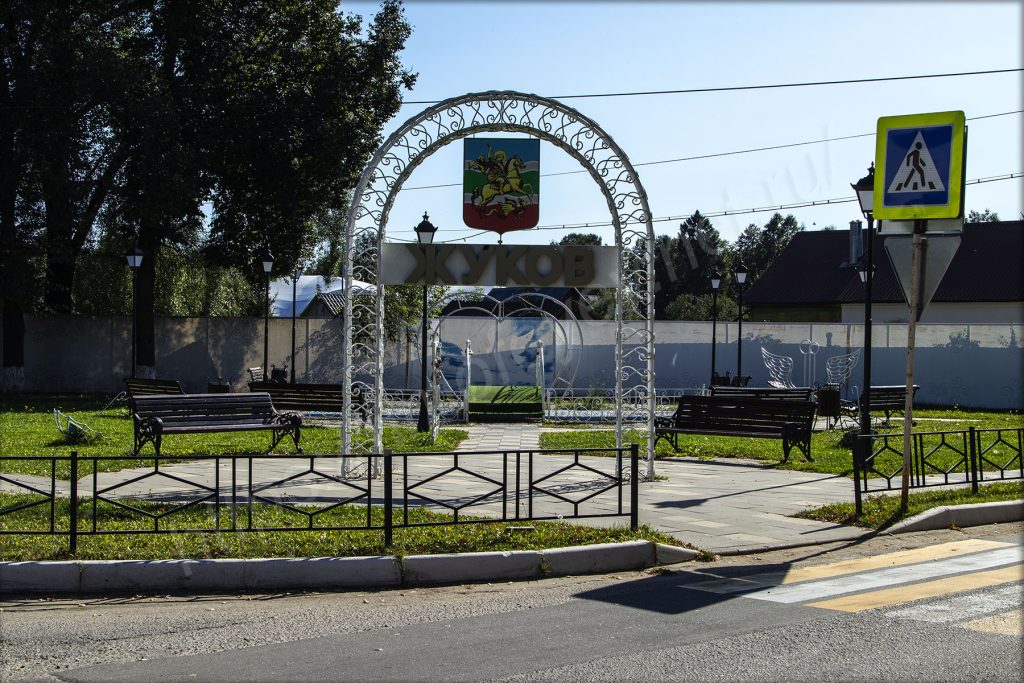 Очередной пролесок и указатель на белом фоне «Жуков». По левую руку такой же частный сектор, за которым начинается территория центральной больницы. Ещё один крутой изгиб, уводящий дорогу вправо, и я уже самом в центре Жукова.