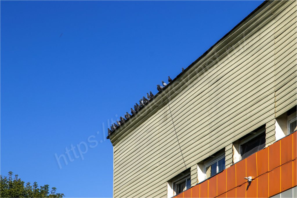 На крыше магазина сидят голуби и явно ищут для себя какую-то жертву или же пропитание. Они время от времени срываются с козырька, совершают вираж над речкой и мостом, и возвращаются обратно, в ожидании нового старта.