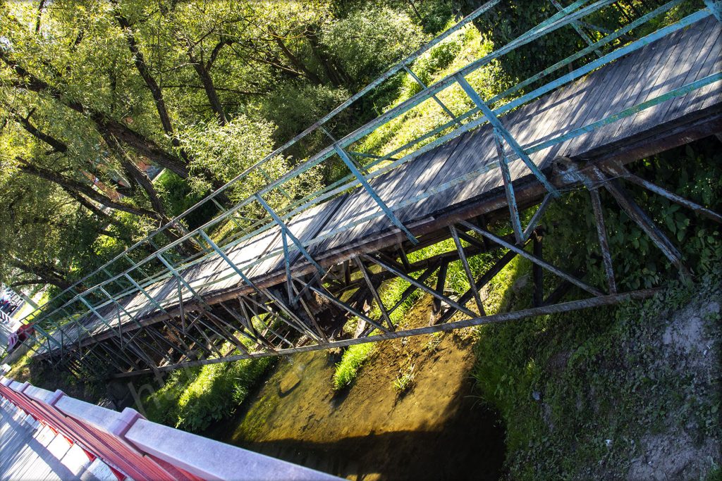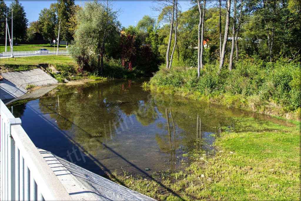 С другой стороны моста стоит старый железный пешеходный мост через речку. По нему даже, вероятно, можно пройти, но не рискнул. Вид здесь просто загляденье. Утопающее отражение неба в речке и в осенних красках, с ещё не сброшенными и почти не пожелтевшими листьями деревьев. Можно любоваться этим долго. Не я один здесь замер, немногочисленные люди, особенно с детьми, останавливаются на какое-то мгновение, любуются и идут дальше по своим делам.