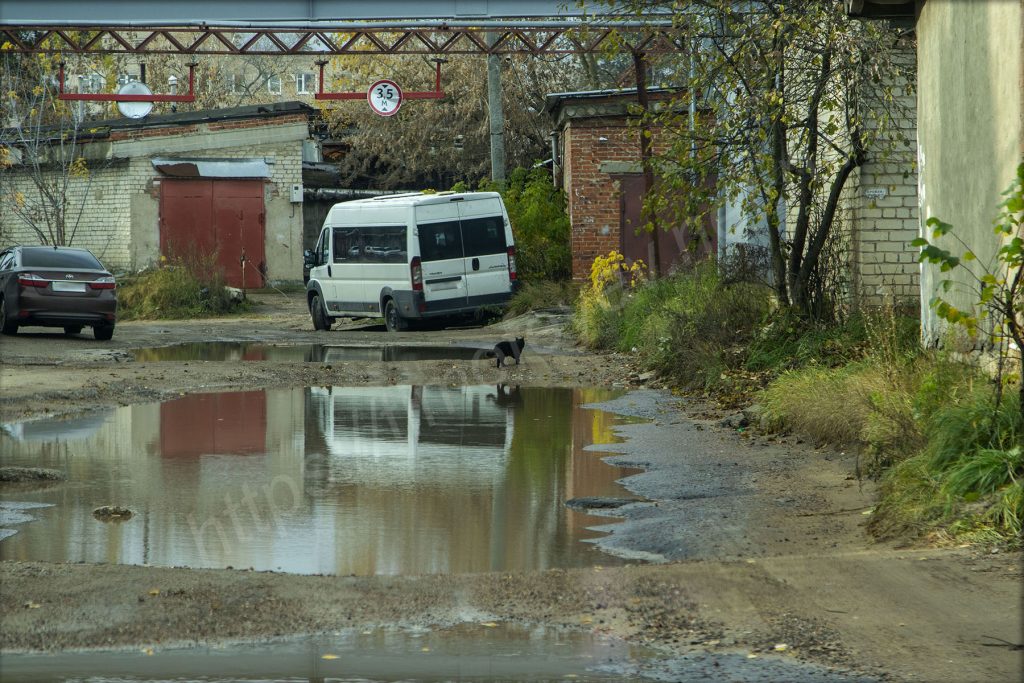 Чем дальше, тем дорога всё хуже и уже. Она делает резкий поворот и дальше на пути находится переезд через железнодорожные пути. Можно сказать, что здесь кончился асфальт и начался кирпичный и прочий бой, а помимо этого открылись целые озёра, которые приходится форсировать на минимальной скорости. Здесь какие-то гаражи — и слева, и справа. Какие-то автосервисы. Вообще не понимаю, куда я попал. Аккуратно двигаюсь вперёд.