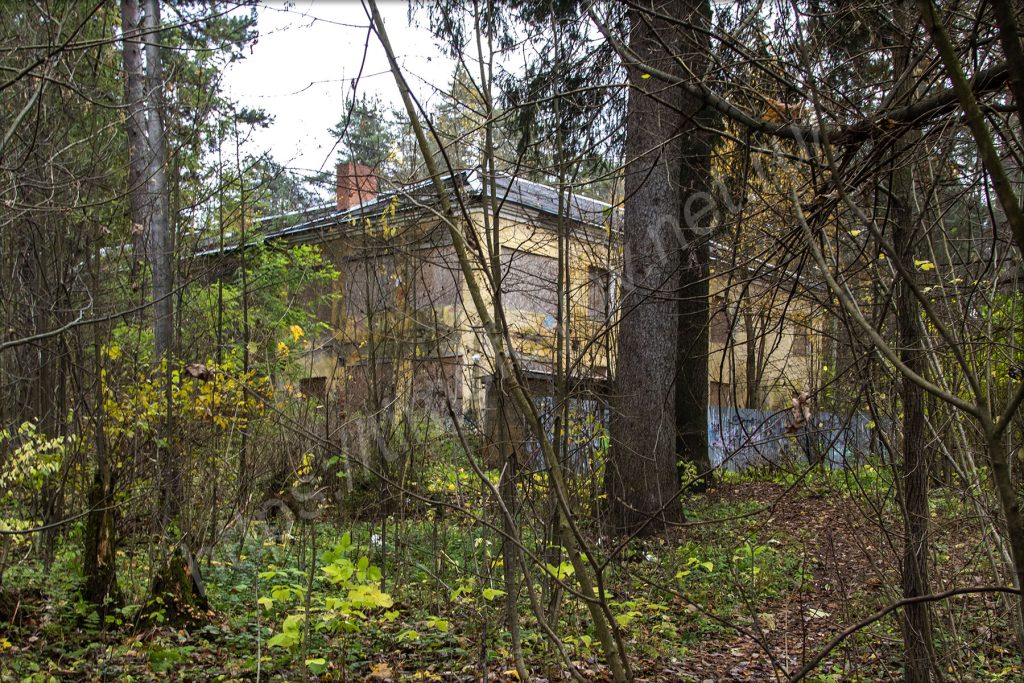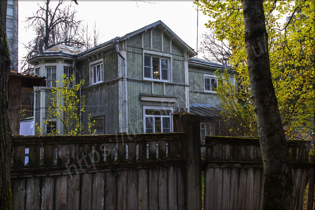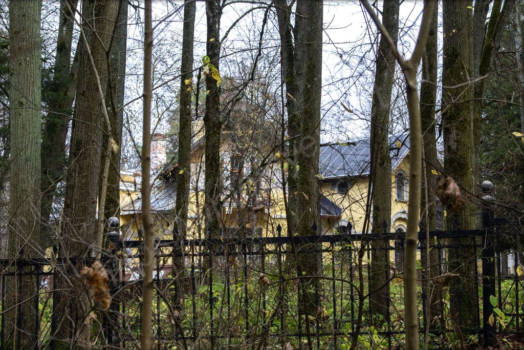 Всё дальше ухожу в лесной массив, где слева находится дача Морозовой. Её из-за стволов деревьев с дорожки не сфотографировать хорошо. Надо лезть ближе к забору. В очередной раз вспоминаю, что я в тряпичных кроссовках. Матерюсь про себя. Сыро! Надо как-нибудь пробраться через этот бурелом и не намочить ноги. Не без труда, но добрался до невысокого забора, напоминающую кладбищенскую ограду. Теперь нужно найти лучший ракурс.