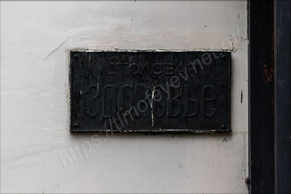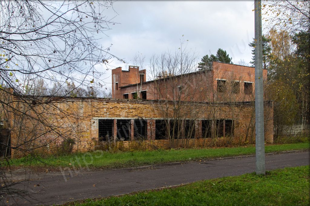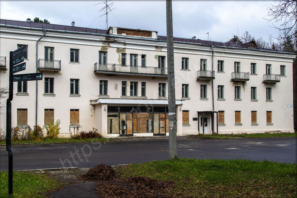 Через дорогу стоит законсервированный дом, который больше похож на бывшее общежитие: то ли для студентов, то ли для работников АЭС. Его фасады точно также находятся в плачевном состоянии и требуют ремонта. Когда подошёл к парадной группе, то из-за закрытых листами ОСБ проёмов послышался грозный собачий лай. Рядом отдельных вход в столовую «Здоровье», которая не работает. Вдали видно, что движение по дороге перекрыто. Там ведутся какие-то земельные работы.