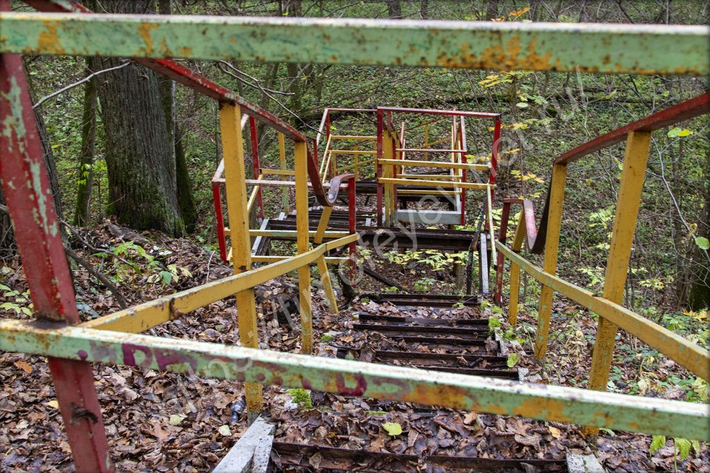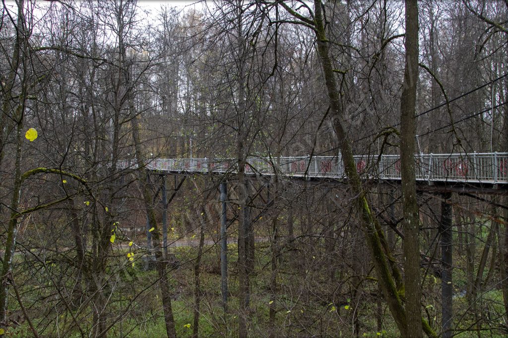 На подвесной мост, что видел на Москве-реке в районе санатория имени Герцена, совсем не похож. Он массивнее и основательнее. Рядом с мостом видны остатки лестниц, по которым можно спуститься в овраг. Вот только ступить на них нельзя — заварено! Да и ступенек-то, смотрю, на ней совершенно нет. Взгляд вниз меня завораживает. Метров тридцать точно есть, если не больше! Жаль, что объектив не передаёт этой глубины.