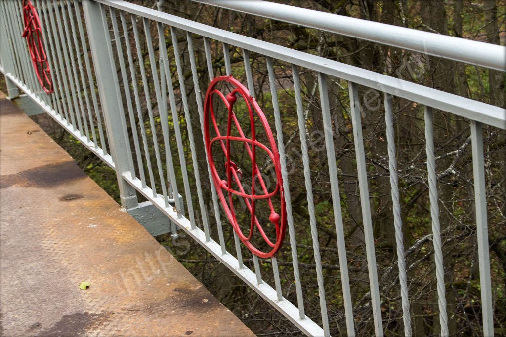 Несмотря на то, что мост заявлен, как подвесной, опоры под ним свидетельствуют совсем о другом — может, он когда-то и был подвесным, о чём свидетельствуют натянутые по его краям тросы, но сейчас он явно другой. Его укрепили снизу. На ограждениях моста есть герб, конечно, он относится к ядерной физике: электроны, вращающиеся по своим орбитам, но вот только где тут атомное ядро? Вместо него висят замки, оставленные молодожёнами. Давно, видать, висят, так как покрасили их вместе с гербом.