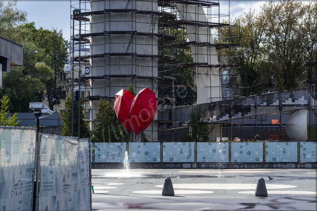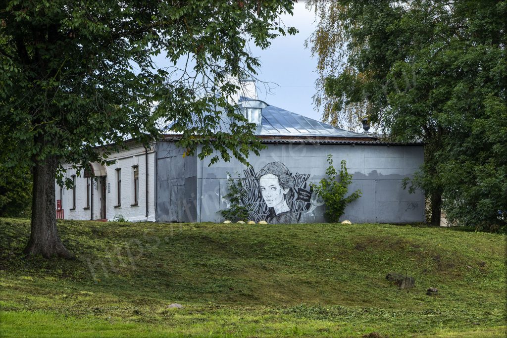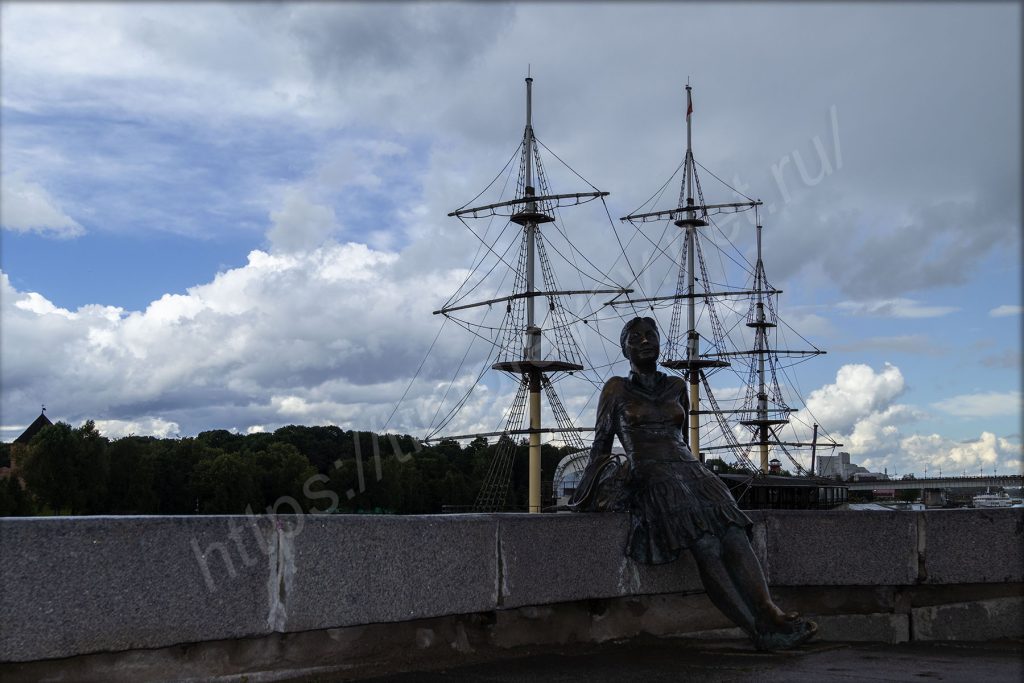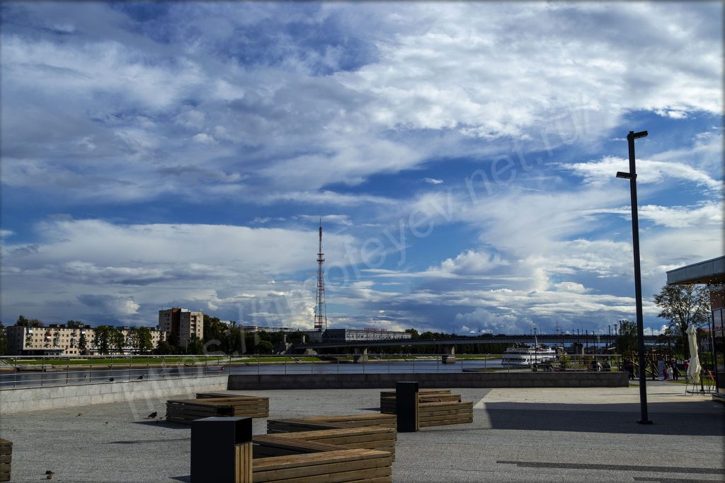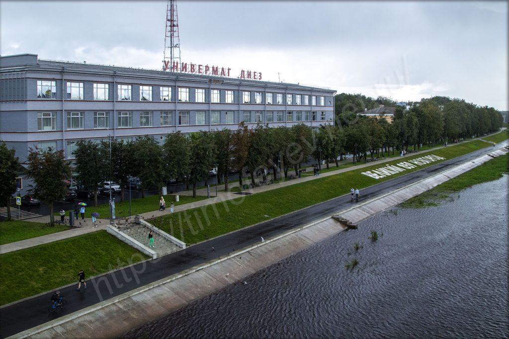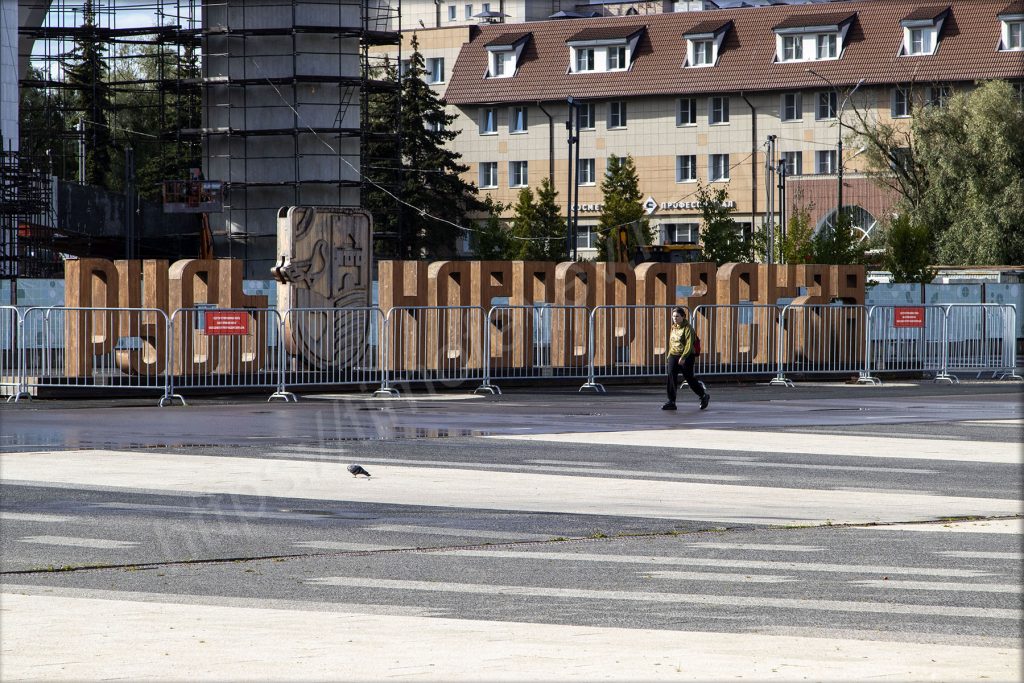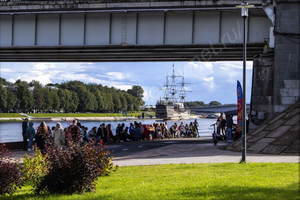 На набережной здесь есть и сухой фонтан и, конечно же, не обошлось без МАФа в виде сердца, но оно почему-то за забором. За ограждениями стоят и буквы, из них сложена надпись «Русь Новгородская», а вместо пробела — герб Новгорода. За ними находится здание театра драмы имени Достоевского. А передо мной какой-то детский праздник в честь дня рождения. Аниматоры развлекают детей. Мне, взрослому, видны все огрехи, но детям нравятся, они погружены в действие под музыку из колонки. Родители стоят в сторонке, фотографируют и снимают видео.