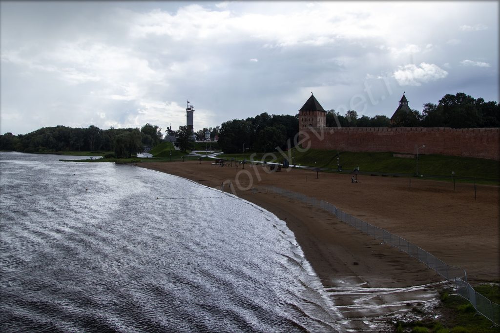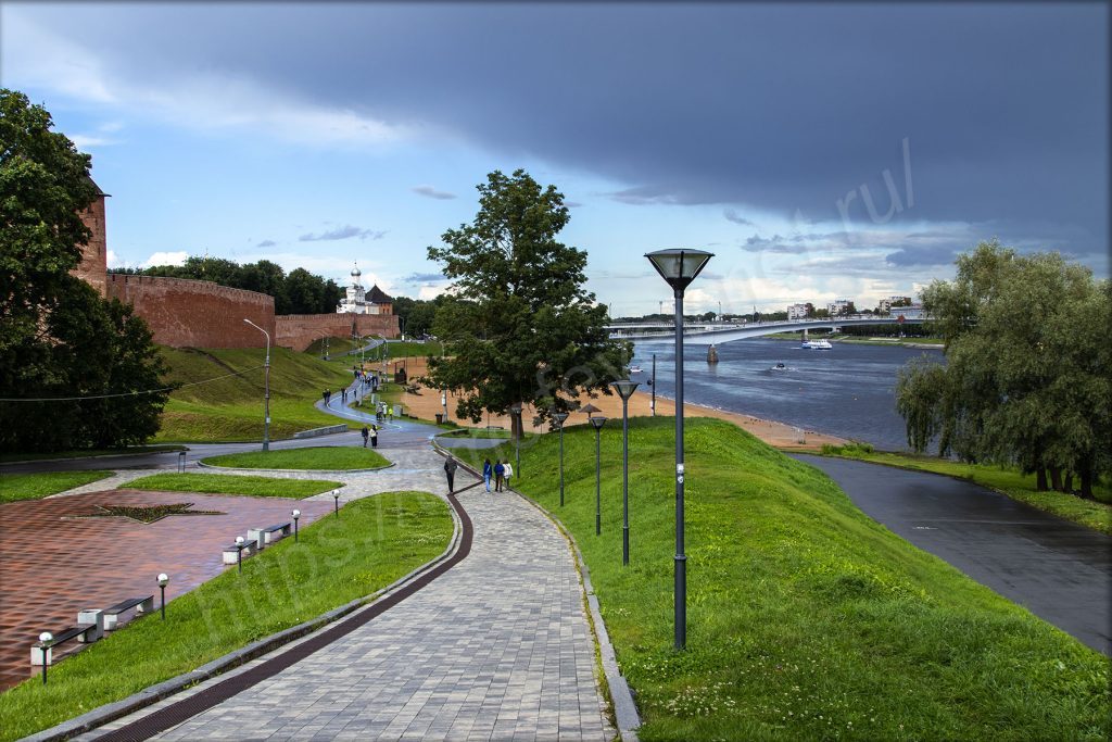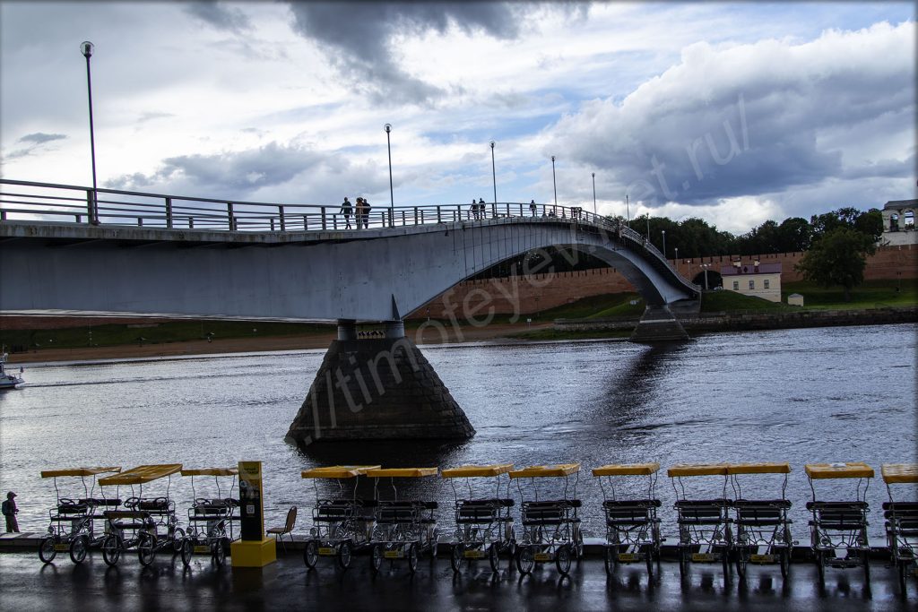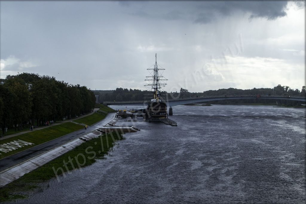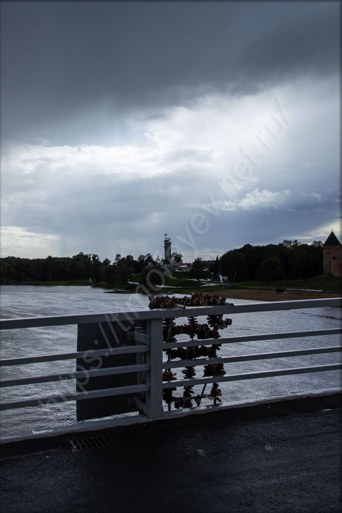 Спустился вниз под мост на том же берегу, куда приехал, и отправился в сторону набережной. Я нахожусь на противоположном берегу от Новгородского кремля. На набережной здесь, как и в Великих Луках, тоже стоят непонятные МАФы. Видимо, благодаря им местное правительство осваивает бюджет города. А мелкий дождь так и моросит. На него просто перестал обращать внимание. Только фотоаппарат сейчас приходится носить объективом вниз. Жалею, что у меня нет дождевика с собой.