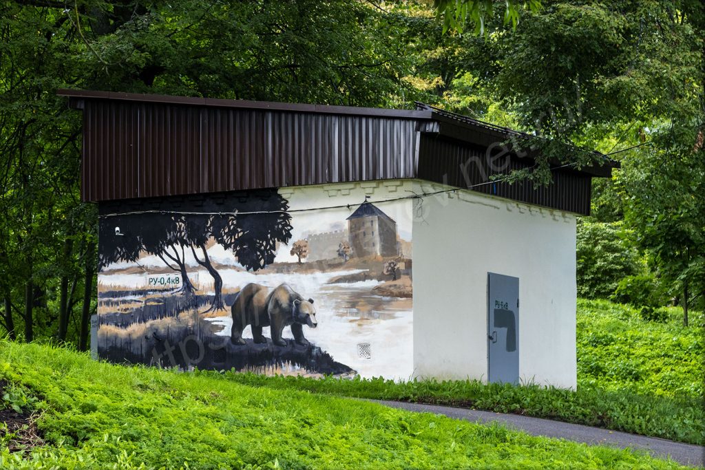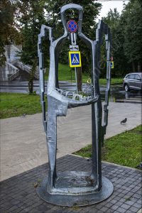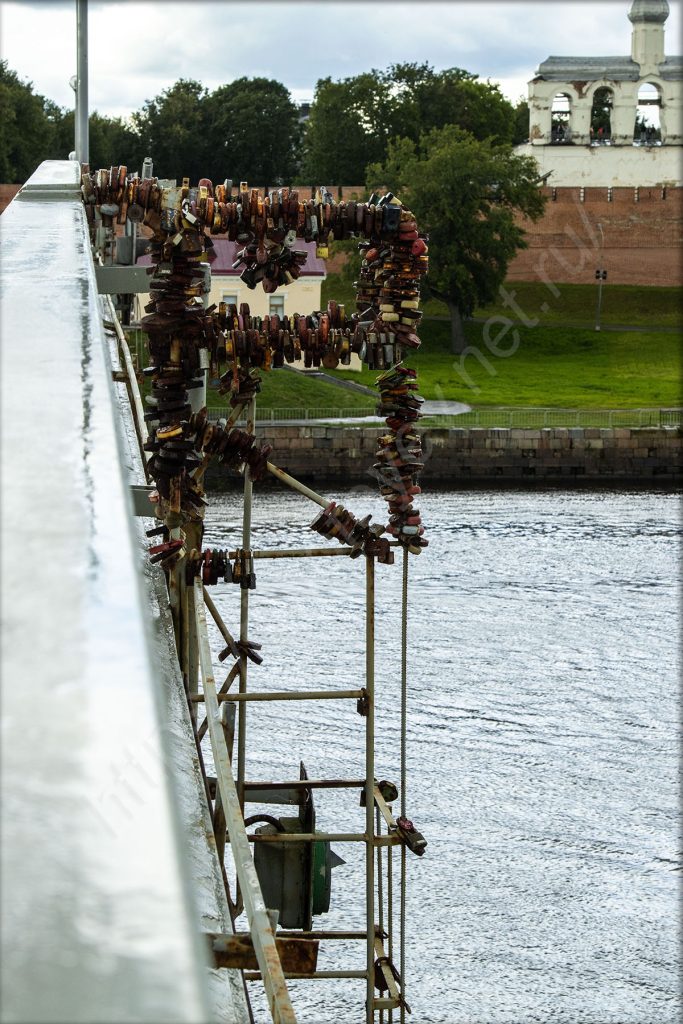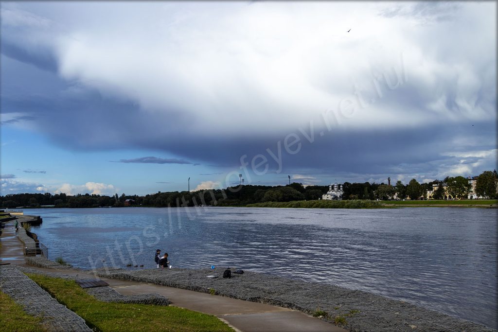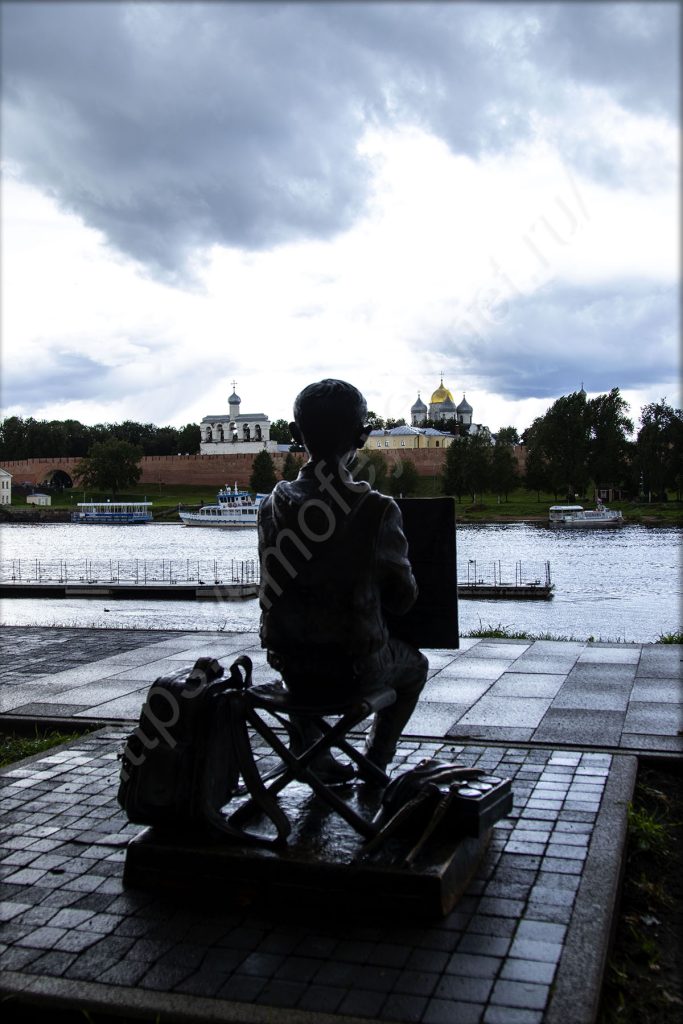 Спустился вниз под мост на том же берегу, куда приехал, и отправился в сторону набережной. Я нахожусь на противоположном берегу от Новгородского кремля. На набережной здесь, как и в Великих Луках, тоже стоят непонятные МАФы. Видимо, благодаря им местное правительство осваивает бюджет города. А мелкий дождь так и моросит. На него просто перестал обращать внимание. Только фотоаппарат сейчас приходится носить объективом вниз. Жалею, что у меня нет дождевика с собой.