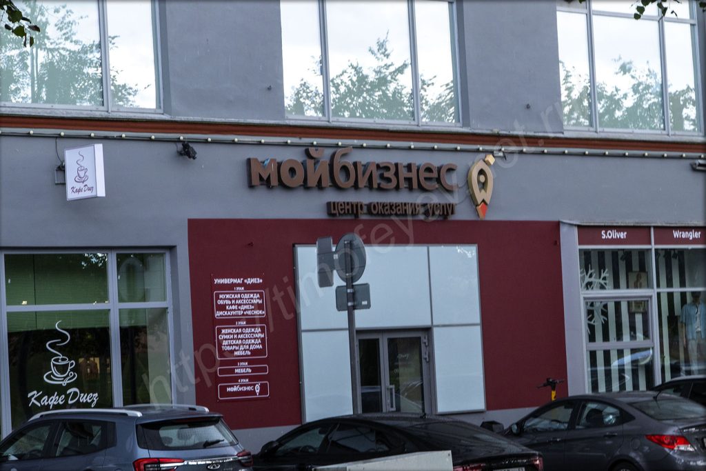 Вдоль набережной находится большое и длинное здание, где находятся магазины и помощь предпринимателям — это универсам «Диез». Подобное видел во время прогулки по Самаре, но вывески на похожем центре были повеселее, как и погода тогда. Правда, они были выполнены также казённо: без выдумки и интереса.