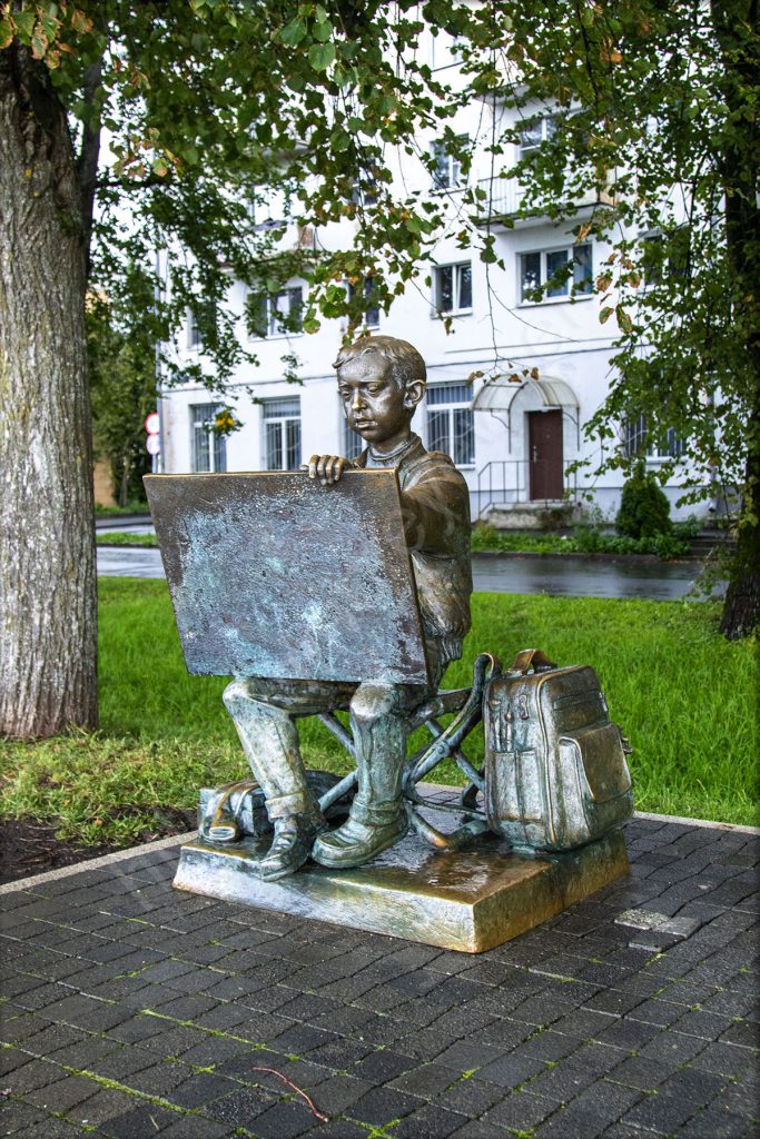 Дальше иду в сторону большого фрегата (ресторана на воде), вставшего здесь на вечный прикол у берега и путевого дворца Екатерины II. По воде рассекают туда-сюда на скорости небольшие лодочки и катера, катающие туристов. По пути мне встречаются жанровые скульптуры. К примеру, передо мной мальчик рисующий кремль («рисующий мальчик»), а чуть поодаль можно посидеть на лавочке рядом с медведем из мультфильма «Маша и медведь» или сделать с ним фотографию.