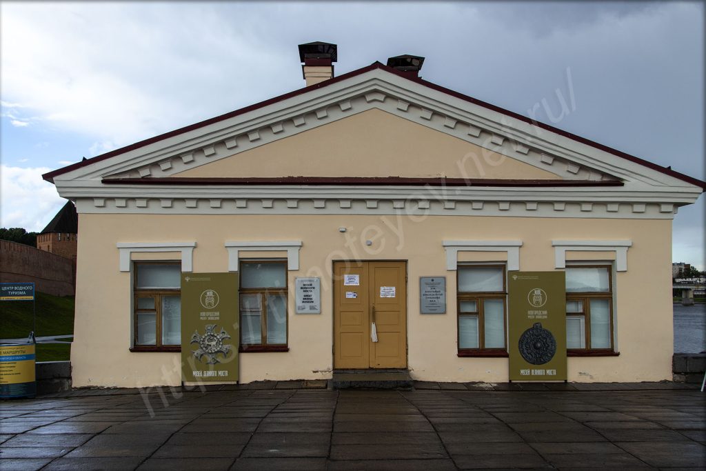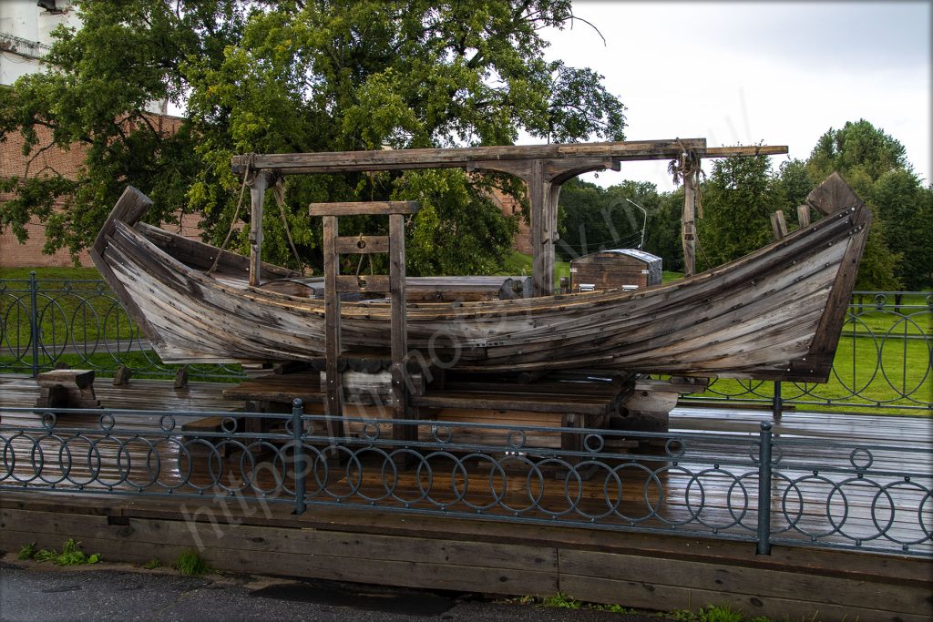 Перейдя горбатый мост, наблюдаю возле него здание-музей, посвящённый этому мосту, а рядом с ним экспозицию с древней лодкой — новгородской ладьёй. И теперь вхожу внутрь кремля через Пречистенскую арку.