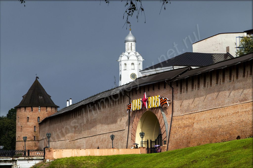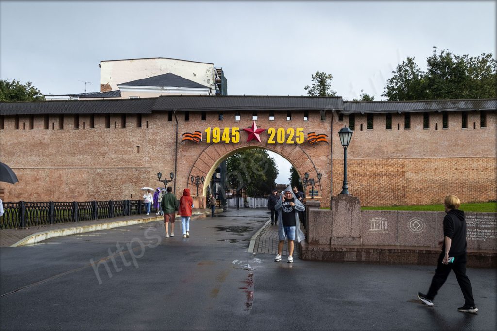 Вот только настроения гулять по территории и куда-нибудь залезать такой погоде у меня особого не наблюдается. Не скажу, что промок или замёрз, но дорога даёт о себе знать. Поэтому пройду территорию Кремля насквозь и выйду из него через Воскресенскую арку. Обернувшись, увижу, что и здесь не смогли промолчать о былых заслугах — над ней висят цифры, символизирующие о великой победе в «сорок пятом».