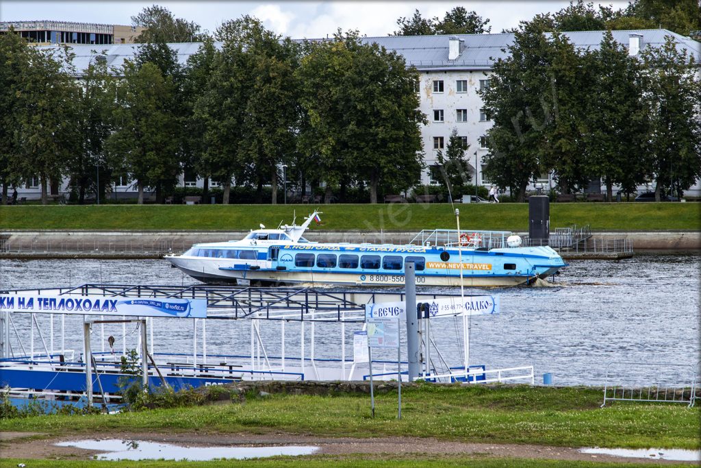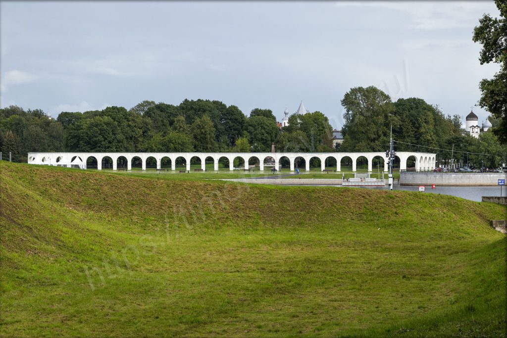 На другом берегу находится длинная аркада — Ярославово дворище. Сейчас за ним разбит небольшой сквер, а чуть правее находится гостиница, конечно же, с названием «Россия»! Перед ними находятся пристани для различных маломерных судов.