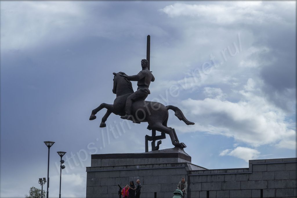 Помимо меня здесь находятся туристы из разных уголков России. Некоторые из них решили подойти поближе к памятнику и даже на него залезть, как тут зазвучит громогласная фонограмма с чётко поставленным мужским голосом, как у Юрия Левитана. В ней сообщалось о том, что они нарушают правило нахождения на объекте и предупреждают, что если не отойдут обратно, то к ним будут применены различные кары. Всякое видел, но такого — такое впервые. У нас в парке Победы на Кутузовском как-то попроще.