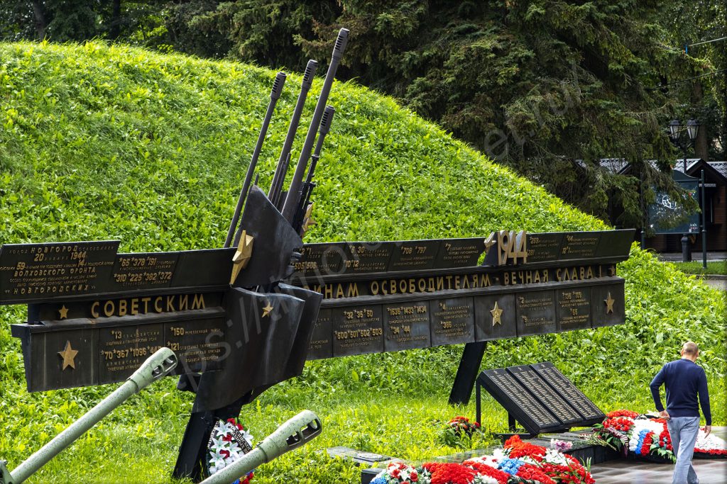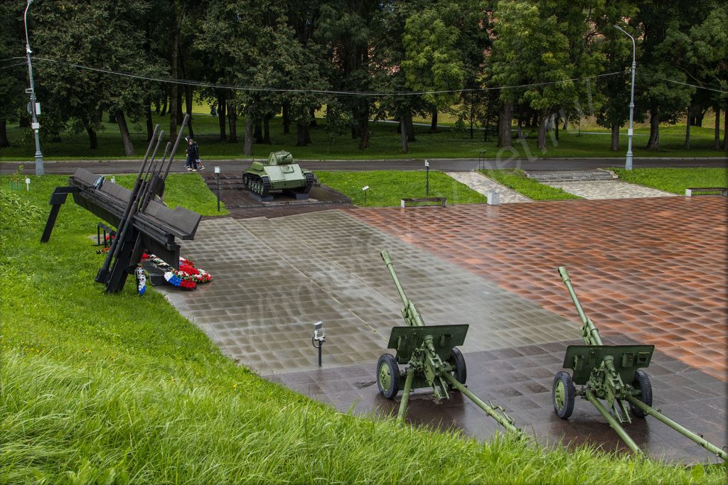 Посмотрел в телефон, там несколько сообщений висит. Отвечаю с фотографиями мест, где сейчас нахожусь. Меня даже переспрашивают о том, где же меня сейчас носит? Не все знают про Великий Новгород и кремль в нём. Внутренне улыбаюсь тому, что всё-таки вырвался из своей рутины и рассматриваю то, чего никогда ещё не видел вживую. Справа от меня, немного на пригорке — экспозиция с советской военной техникой и каким-то памятником. Надо подойти поближе и рассмотреть.