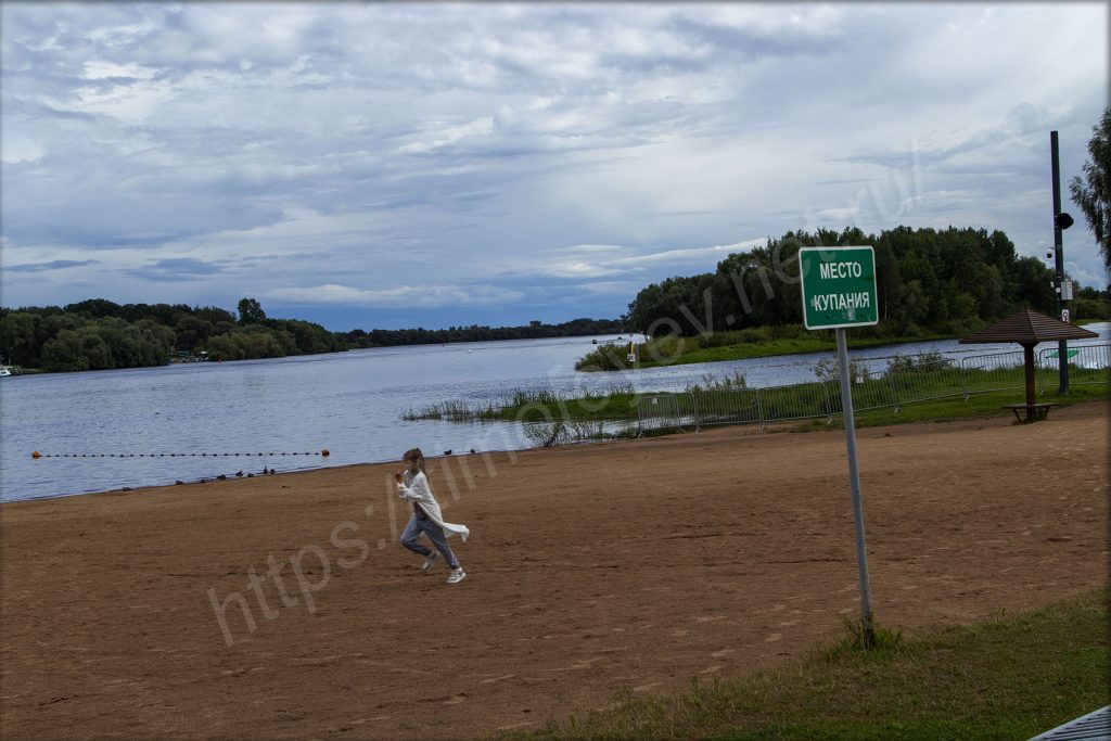 Если посмотреть в другую сторону с моста, то можно увидеть пляж у стен кремля, который сейчас пустынен. Да и купаться здесь нельзя, только загорать, но явно не сезон.