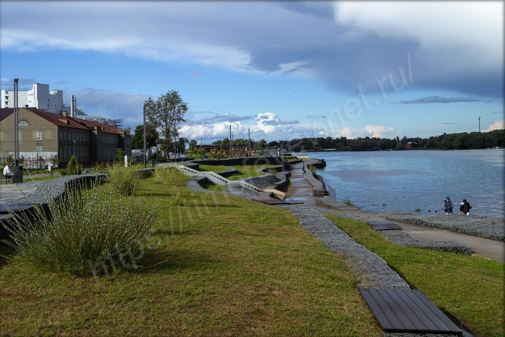 Если смотреть под ноги, то здесь очень интересно наблюдать то, сколько всего намешано. И старый асфальт встречался, и новая плитка, выложенная мозаикой, и вот — бетонные плиты. Видимо, всё создавалось и делалось в разное время, а на переделку другого и приведение к общему знаменателю, то есть к общему виду, бюджета не было. И получилось-то очень неплохо! Мне нравится идти тут — по Великим Лукам Новгородской набережной.