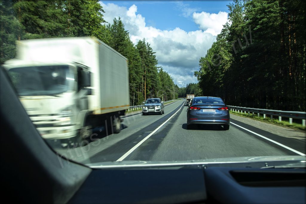 Дорога, тем временем, становится уже. Где-то два ряда, где-то три, чтобы была возможность обгонять тихоходов. Почти везде сплошная. Рисковать с обгонами здесь не вижу никакого смысла, так как дорога здесь вся ломанная и постоянно скрывается где-то за лесами и поворотами.