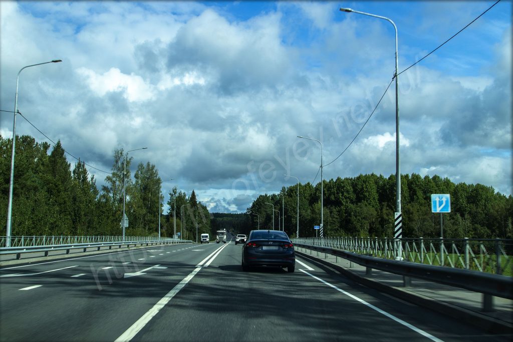 Пасмурно и иногда даже что-то капает, но с прояснениями пока еду. Ещё одной примечательностью того поворота будет очень большая чёрная-чёрная туча. Она меня ещё на подъезде пугала своими размерами. Сворачиваю на клеверной развязке, заезжаю на мост и теперь по не менее широкой дороге направляюсь прямиком в эту тучу. Так и задумался, а точно ли в Приозёрске можно будет выйти из машины? Впрочем, не разворачиваться же!