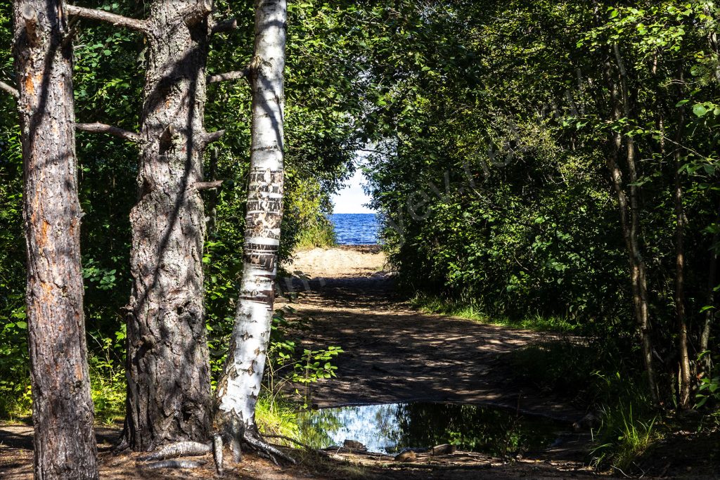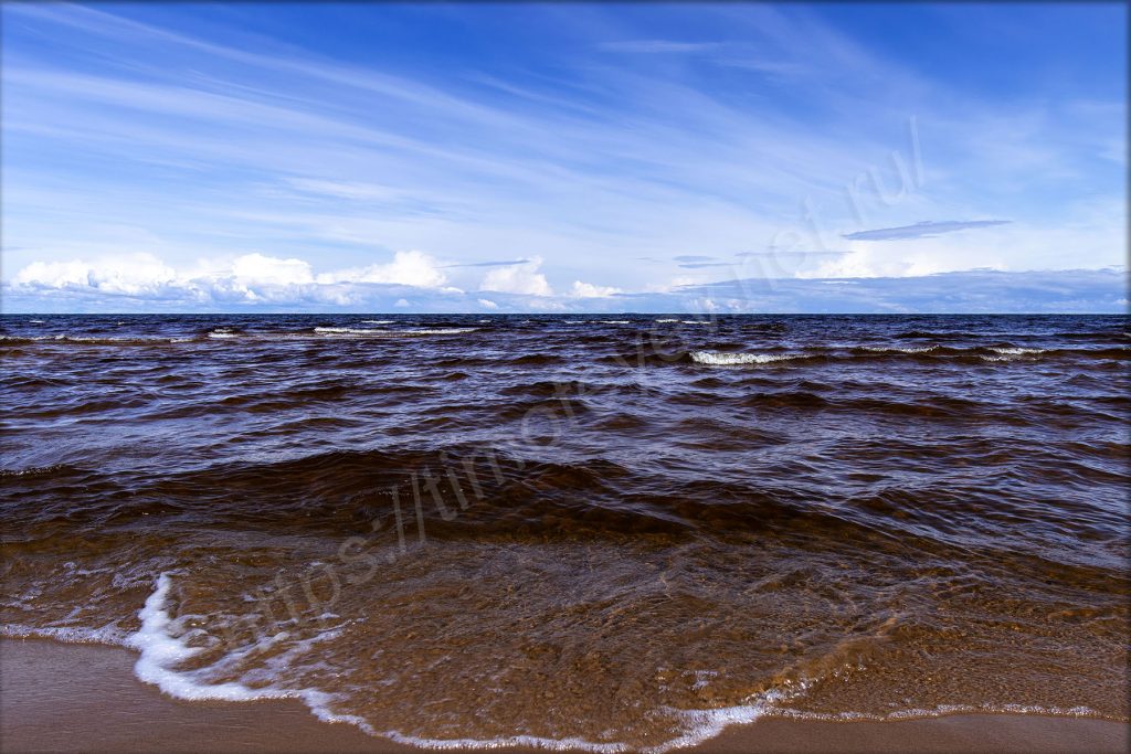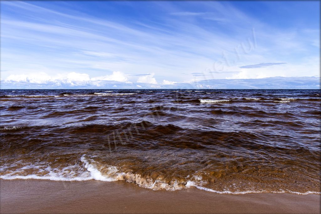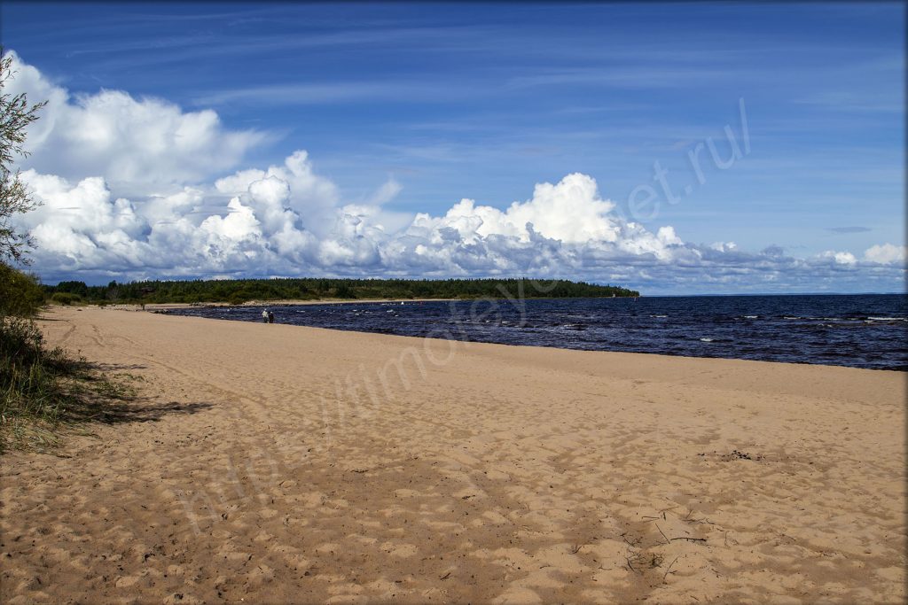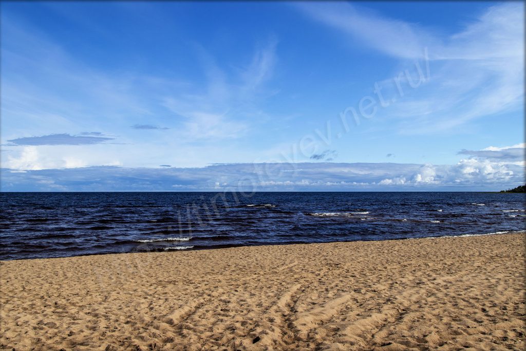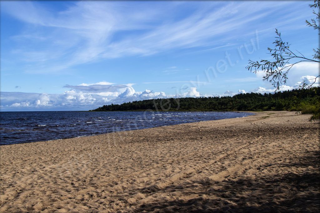 Выхожу на пляж и, окинув его взглядом, про себя восторгаюсь количеством песка, воды и солнца. На небе практически ни облачка, если смотреть на Ладожское озеро. Какой ливень? Ты что?! Песок под ногами тоже почти сухой. Кроме меня здесь пара-тройка человек, также гуляют. Пляж ограничен мысами с двух сторон и не продуваем почти всегда, так как ветрам сюда сложно попадать (и сзади меня тоже лес). Вода, набегая волна за волной, шумит о берег. Она имеет коричневатый оттенок, как всякая озёрная. Впрочем, если закрыть глаза, то можно ощутить себя на морском побережье: шум воды, лёгкий и приятный бриз. Если не было людей совсем, то — на необитаемом острове.