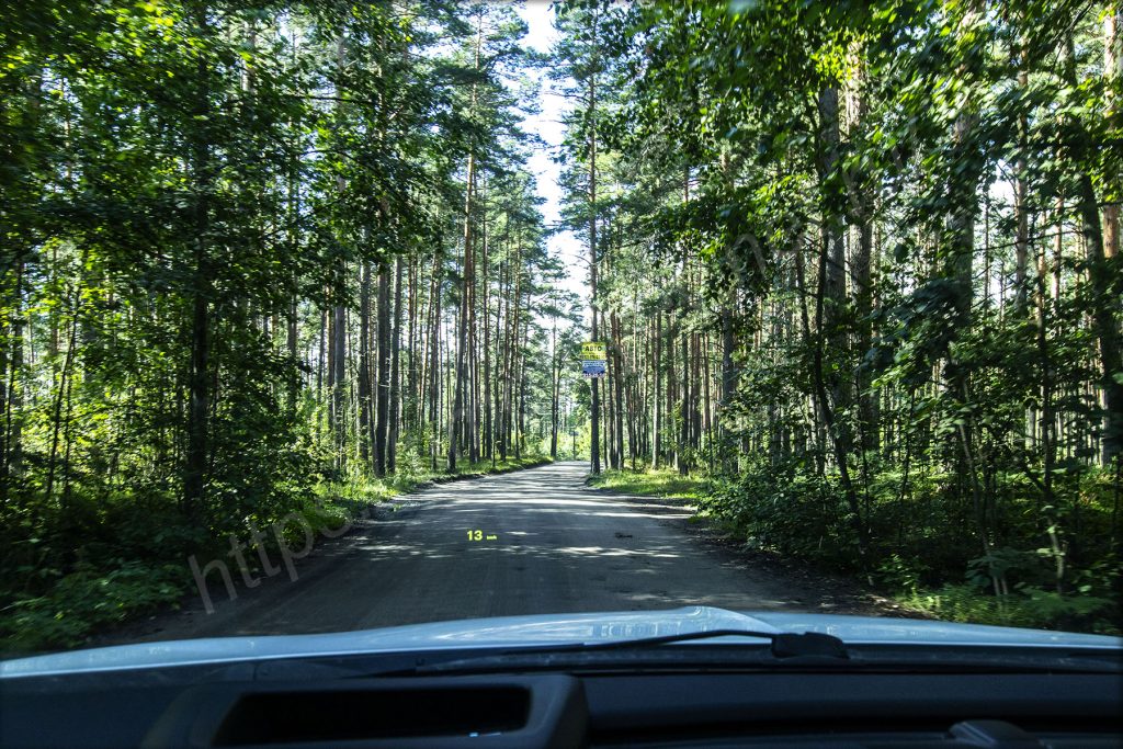 Судя по указателю еду к какому-то дачному посёлку, находящемуся за деревней. Дорога здесь укатанный песок, конечно же, с колдобинами, поэтому приходится красться по сосновому лесу. На такой небольшой скорости меня очень выручает система кругового обзора. Благодаря ей можно видеть то, что творится перед твоим большим носом. Особенно, если дальше спуск.