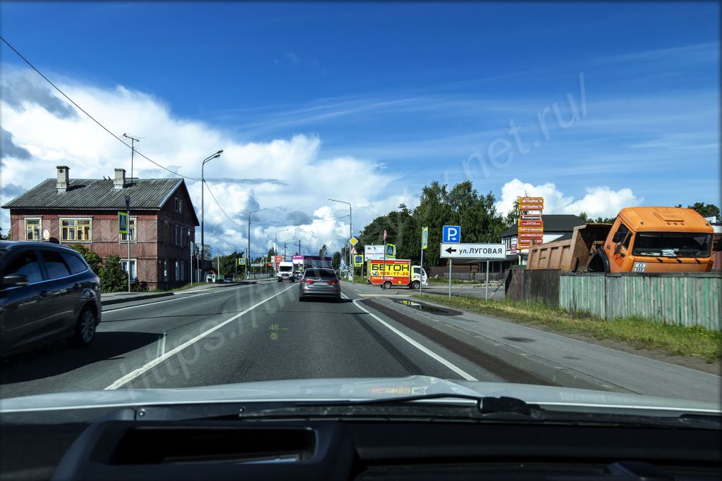 Что до домов, то новых, вдоль Ленинградского шоссе, мне увидеть не удалось, а те, что есть, находятся в удовлетворительном состоянии. Чаще они деревянные, чем каменные или кирпичные. Много различной рекламы услуг. Пустили движение по нашей стороне, и мне удалось доехать до поворота на крепость, куда быстро свернул.
