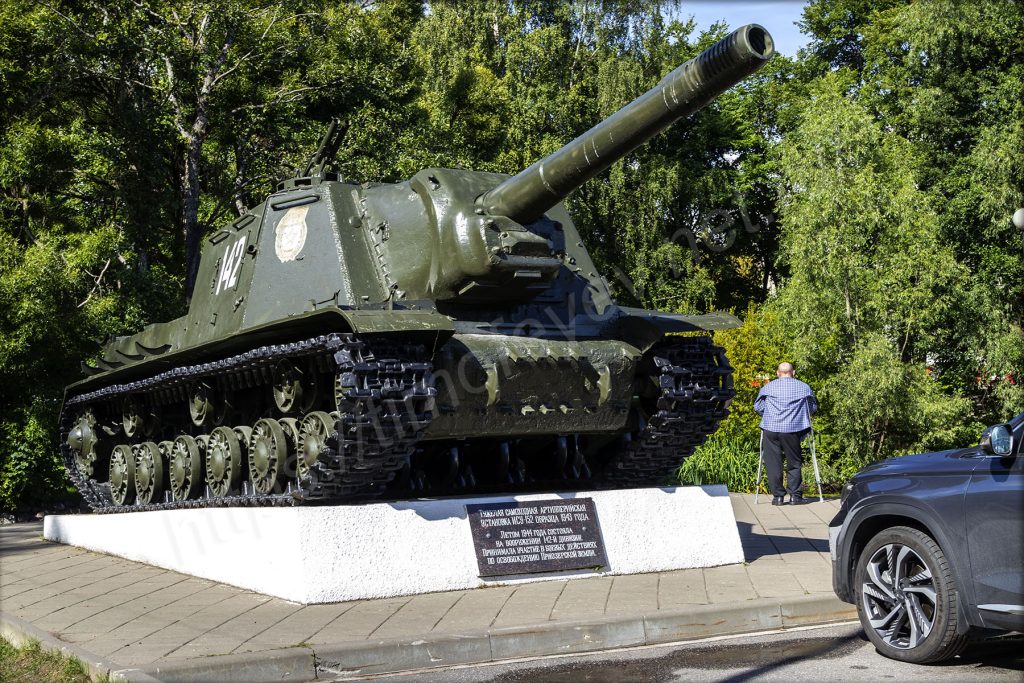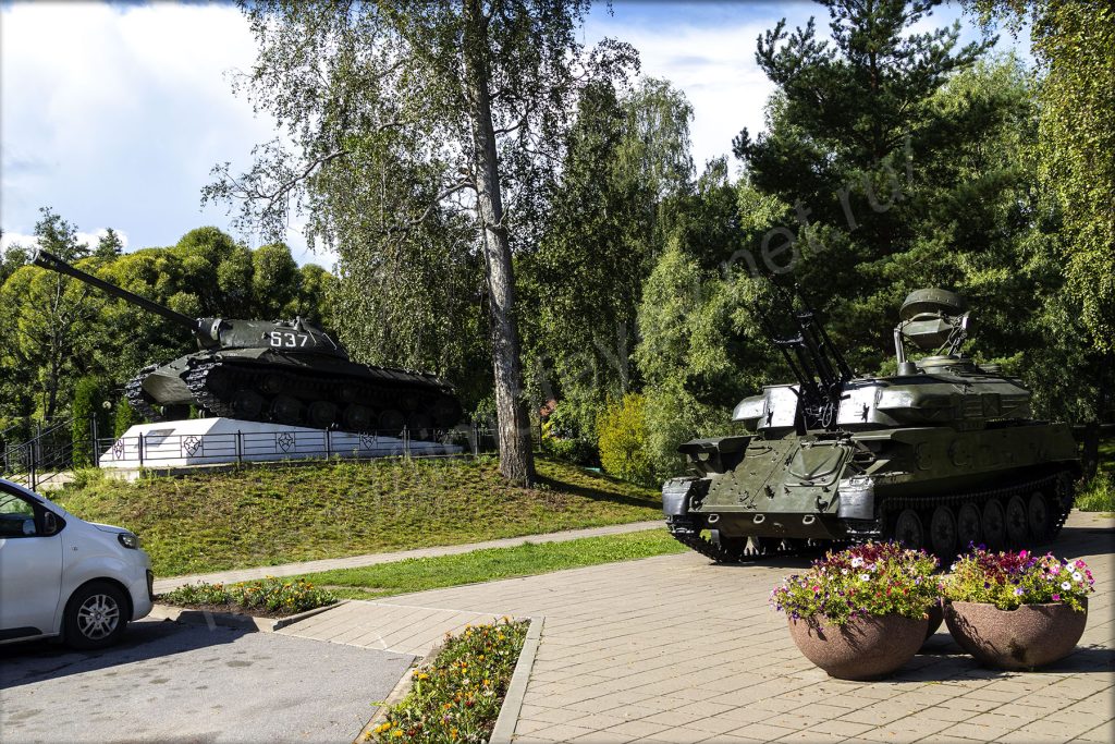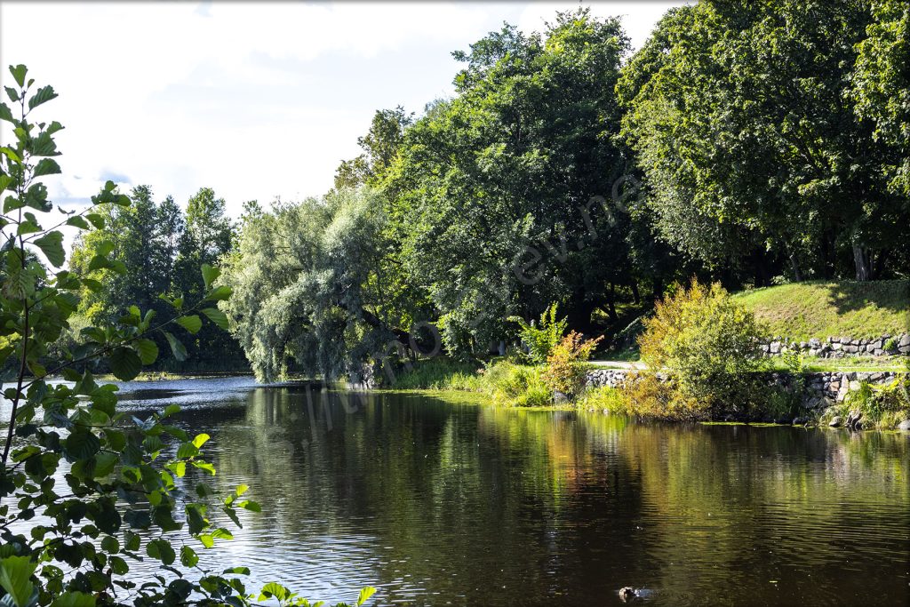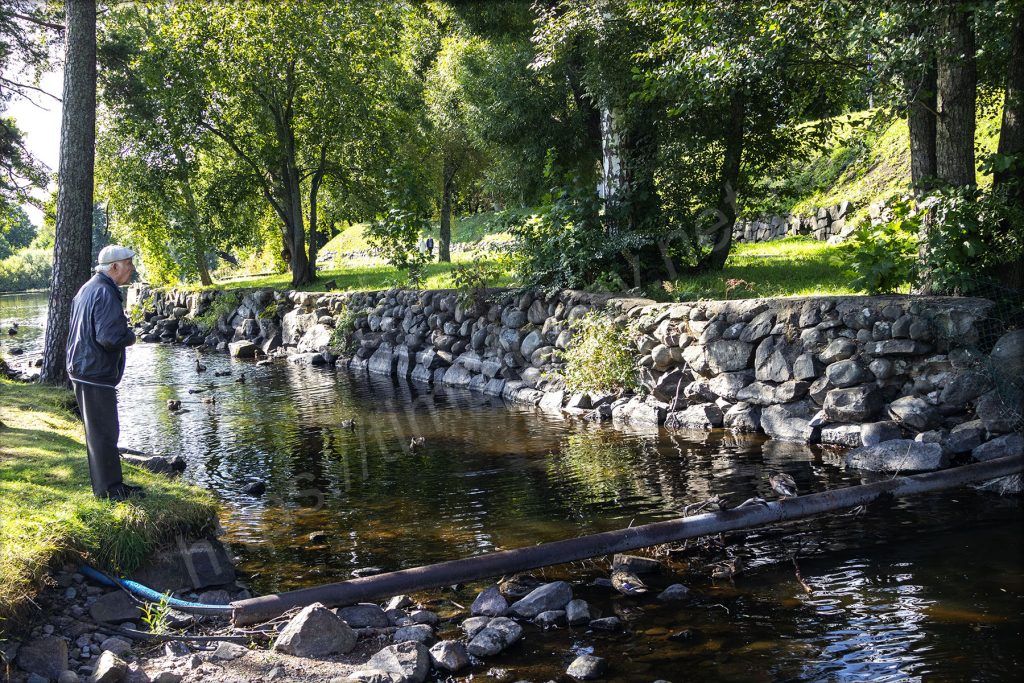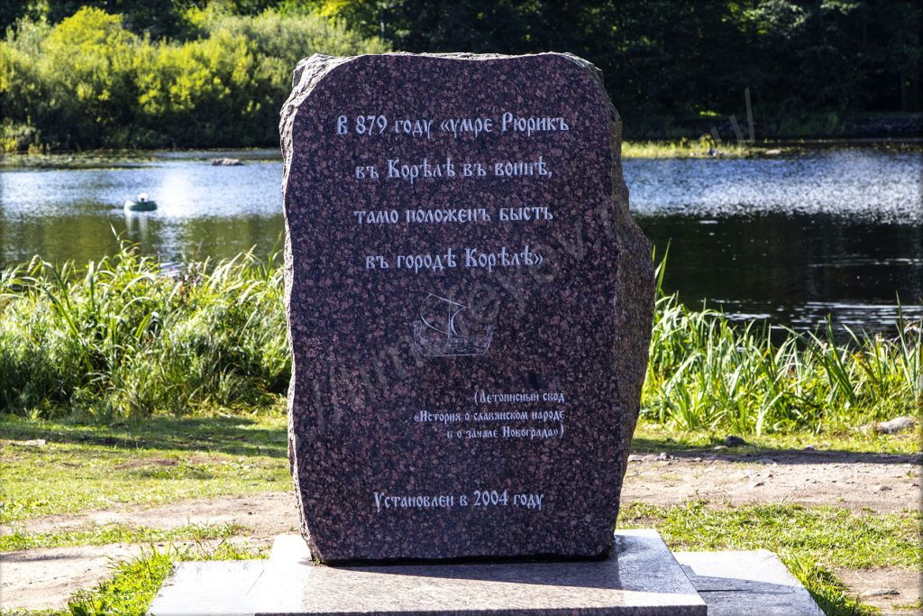 Возле парковки стоят приведённые в порядок (навели внешний лоск) зенитки, танки и прочая техника — всё в духе празднования восьмидесятилетия победы. Захожу за них, на какой-то проток. Он похож на искусственно сделанный канал, в котором плавают утки. Я уже и забыл, что нахожусь на острове. На другой стороне вижу, что берега также привели в порядок и навели ландшафтный дизайн вдоль границы с островом. Дохожу до крайней точки, где здесь можно пройти — передо мной озеро Вуокса и памятный камень об основании Корелы самим Рюриком.