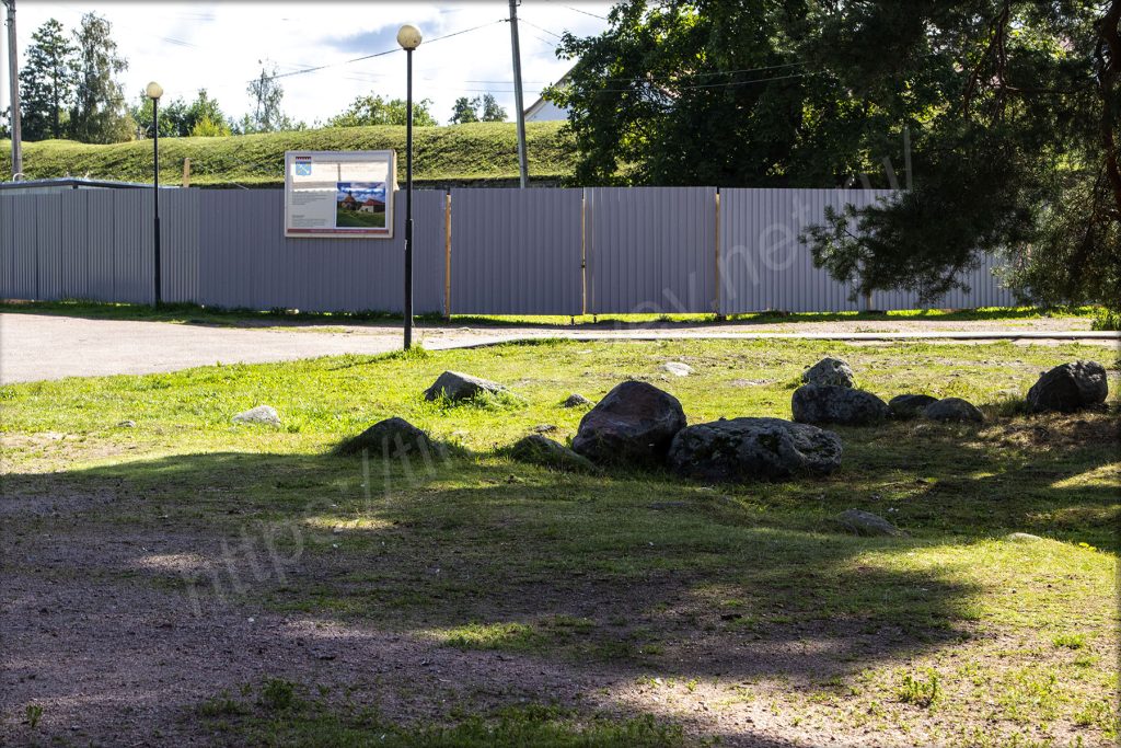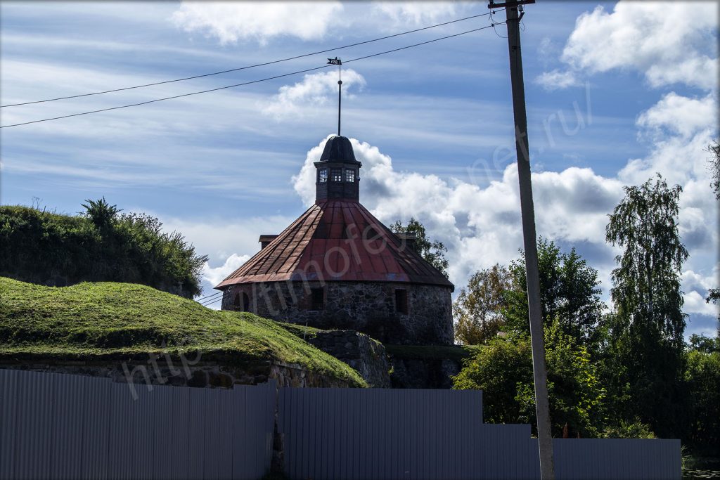 Сама крепость Корела или Кексгольм сейчас скрыта частично от моего взора забором. Из того, что могу здесь увидеть, это каменный забор и насыпь на нём, высотой, как высота забора, то есть метра три или чуть-чуть больше, за которой находятся постройки и круглая надвратная башня (недействующая сейчас) — Пугачёвская. По верху «склонов» есть ливнёвки для отвода дождевой воды. Вспоминая дорогу сюда, думаю, что совсем не зря. Местами вижу ограду по самому верху.