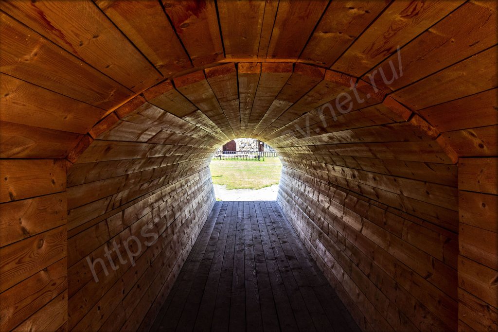 Дальше сквозь узкий и длинный туннель или проход, сделанный в стене крепости, обрамлённый изнутри досками и имеющий деревянные ворота, пройду внутрь. Длина туннеля метров десять точно. Массивная стена, однако! А вот внутри всё достаточно грустно. К стенам не подходить, никуда не залезать — всё находится в аварийном состоянии. Подъёмы на стены и укрепления — конечно, запрещены. Территория внутри аккуратно выкошена и прибрана. К достопримечательностям подходы тут перекрыты заборчиками, но рассмотреть их можно издали.